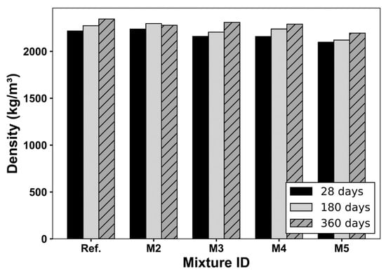 Figure 6 presents the bulk density evolution of the concrete mixtures cured in water over hydration time. The Ref. mixture (M1) consistently showed the highest density values, indicating a compact and well-hydrated matrix. In the case of M2, containing 15 vol% CS, a slight reduction in density was observed at early ages (28 days), but the difference narrowed by 180 days and remained small at 360 days. This trend suggests the progressive contribution of the pozzolanic activity of CS to matrix densification, especially at extended curing ages, such as 180 and 360 days, which aligns with that reported in previous studies [,,]. The implemented curing temperature (23 ± 2 °C) was within the optimal range for the progression of pozzolanic reactions, including the slow-reacting phases in CS such as amorphous silicates and aluminates. Prior studies [] confirm that prolonged curing under these conditions promotes C–S–H formation and densification of the microstructure. Mixtures M2, M3, and M4, combining CS and increasing amounts of RCAs, exhibited a monotonic reduction in density proportional to the RCA content. At 180 days, this reduction was already evident and reflects the influence of RCA’s higher porosity and lower specific gravity. The results at 360 days confirm that later hydration stages only partially mitigate the effect of RCA on the bulk density of the concrete mixtures.