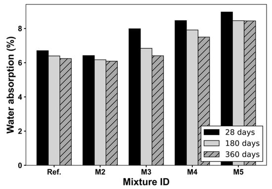 Subsequently, Figure 7 shows the water absorption capacity of the mixtures as a function of curing age. Both the Ref. and M2 mixtures exhibit the lowest absorption levels, with very similar values from 180 days onward. This behavior confirms that the replacement of cement by 15% of CS does not negatively affect the permeability of the concrete matrix, and even improves it at extended curing ages, through refinement of the pore structure []. In mixtures with RCA and 15% CS (M2–M4), water absorption monotonically increases as the RCA replacement level increases. At 180 days, the differences between the Ref. and 15 CS-RCA-containing mixes were already pronounced, highlighting the persistent influence of RCA’s internal porosity; a similar trend was obtained in a previous work []. Although some reduction in absorption occurs between 28, 180 days and 360 days, due to ongoing hydration, the improvements are insufficient to compensate for the inherently porous nature of the RCAs [].
