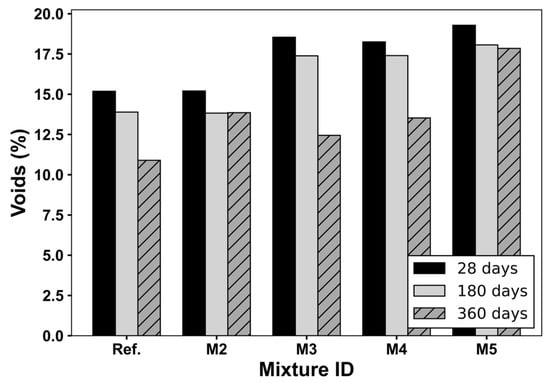 Finally, Figure 8 displays the void content evolution across curing ages. Ref. and M2 mixtures maintain the lowest void content values at all ages. Notably, at 180 days, the voids in M1 decreased further compared to 28 days, likely due to the delayed formation of additional C–S–H from the reaction of CS. This confirms the interpretation that CS promotes progressive pore filling in extended curing conditions, as reported in previous studies [,]. In contrast, mixtures containing 15% CS-RCA (M3–M5) exhibit higher void contents overall, consistent with the increased porosity, microcracking, and heterogeneity of the interfacial transition zone (ITZ) introduced by the RCAs []. However, by 360 days, a noticeable reduction in void content (%) is observed in M2 and M3, suggesting that ongoing hydration partially compensates for the microstructural weaknesses introduced by RCAs. Despite this improvement, their void levels remain above those of Ref., though slightly lower than M2, indicating that the combined use of CS and RCAs may promote a viable densification mechanism over time, potentially offsetting some of the drawbacks associated with RCA alone.
