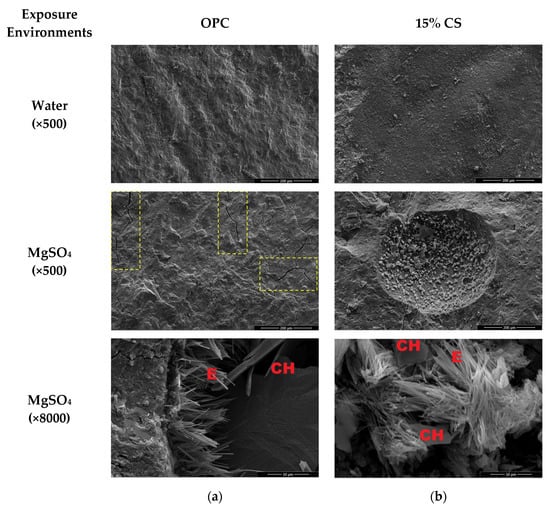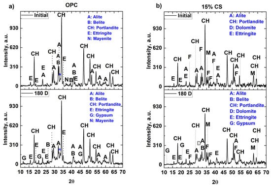 Figure 9 shows the XRD patterns of mixtures containing 100% OPC and 15 vol% CS, collected after 28 days of water curing (initial condition) and after 180 days of exposure to a MgSO4 solution. In Figure 9a, distinct diffraction peaks corresponding to portlandite (CH), ettringite (E), albite (A), belite (B), and mayenite (N) are observed before the sulfate exposure. A and B are unhydrated clinker phases, while E (AFt) and CH are typical hydration products. At 180 days of exposure, a decrease in the intensity of the CH peaks was observed, suggesting the consumption of this phase for the generation of AFt and gypsum. This behavior was also observed by Wang et al. [], who reported a decrease in CH peaks and an increase in peaks corresponding to ettringite, gypsum and brucite. This phenomenon was attributed to the consumption of Ca2+ induced by the presence of SO42−, which favors the formation of gypsum when the mixtures are exposed for prolonged periods in this solution. On the other hand, it should be also emphasized that C–S–H, due to its low crystallinity, is not detected by XRD [] either before or after exposure.
