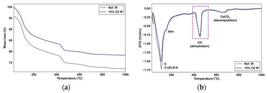 In the TG curve, Figure 11a, the total mass loss between 50 and 1000 °C reaches approximately 21.5% for Ref. W and 20.37% for 15% CS W, reducing the gap observed at 28 days. In the first peak observed in the 80–200 °C region, which corresponds to the dehydration of C-(A)-S-H gel and AFt/AFm phases [], the mass loss values are approximately 9.73% for Ref. W and 9.39% for 15% CS W, reflecting a comparable degree of hydration in the CS-blended cement and Ref. W. Moreover, it is possible to observe for the second peak between 400 and 500 °C, which is associated with the dihydroxylation of portlandite (Ca(OH)2), that portlandite content is 17.52% lower for 15% CS W compared to Ref. W due to its partial consumption by the CS pozzolanic reaction, similar to the obtained by Silva et al. [] in their previous work. Finally, the peak between 600 and 800 °C associated with the decomposition of calcium carbonate (CaCO3) [], was nearly identical for both pastes, suggesting carbonation during sample preparation.