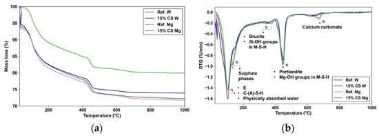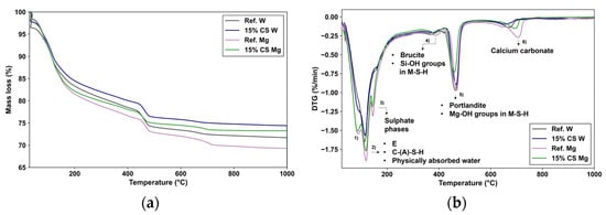 Subsequently, a second DTG peak (labelled b) emerges between 100 and 150 °C is visible, and more pronounced in Ref. Mg than in 15% CS Mg. As reported by Lee et al. [], this region reflects the overlapping dehydration of sulphate phases, including ettringite, thaumasite, and gypsum. The stronger intensity in Ref. Mg suggests a greater formation of gypsum, due to the higher availability of Ca2+ from portlandite. Conversely, the lower intensity in 15% CS Mg supports the hypothesis that less gypsum precipitates and that the dominant degradation product in 15% CS Mg is M–S–H, consistent with a more advanced attack on the C–S–H structure.