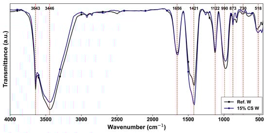 In the TG curve, Figure 12a, the total mass loss between 50 and 1000 °C reaches approximately 24.5% for Ref. W and 23.12% for 15% CS W, thus maintaining the reduced gap previously observed at 180 days. In the first and second peak observed in the 80–200 °C region, that corresponds to the dehydration of C-(A)-S-H gel and AFt/AFm phases [], the mass loss values are approximately 10.92% for Ref. W and 10.80% for 15% CS W, showing a continued comparable degree of hydration in the 15% CS W and Ref. W. In the second peak located between 400 and 500 °C, which is associated with the dihydroxylation of portlandite (Ca(OH)2), portlandite content is 22.33% lower for 15% CS W compared to Ref. W due to its partial consumption by the CS. Similar to the obtained by Silva et al. [] in their previous work. Finally, the peak between 600 and 800 °C associated with the decomposition of calcium carbonate (CaCO3) [] is equivalent for both samples, likely resulting from carbonation during sample preparation.