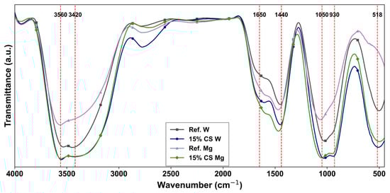 Figure 13 exhibits the FTIR spectra of OPC pastes and those incorporating 15 vol% of CS as cement replacement after 28 days of water curing, while Figure 14 shows the corresponding spectra after 180 days of exposure to either water or a 5% MgSO4 solution.