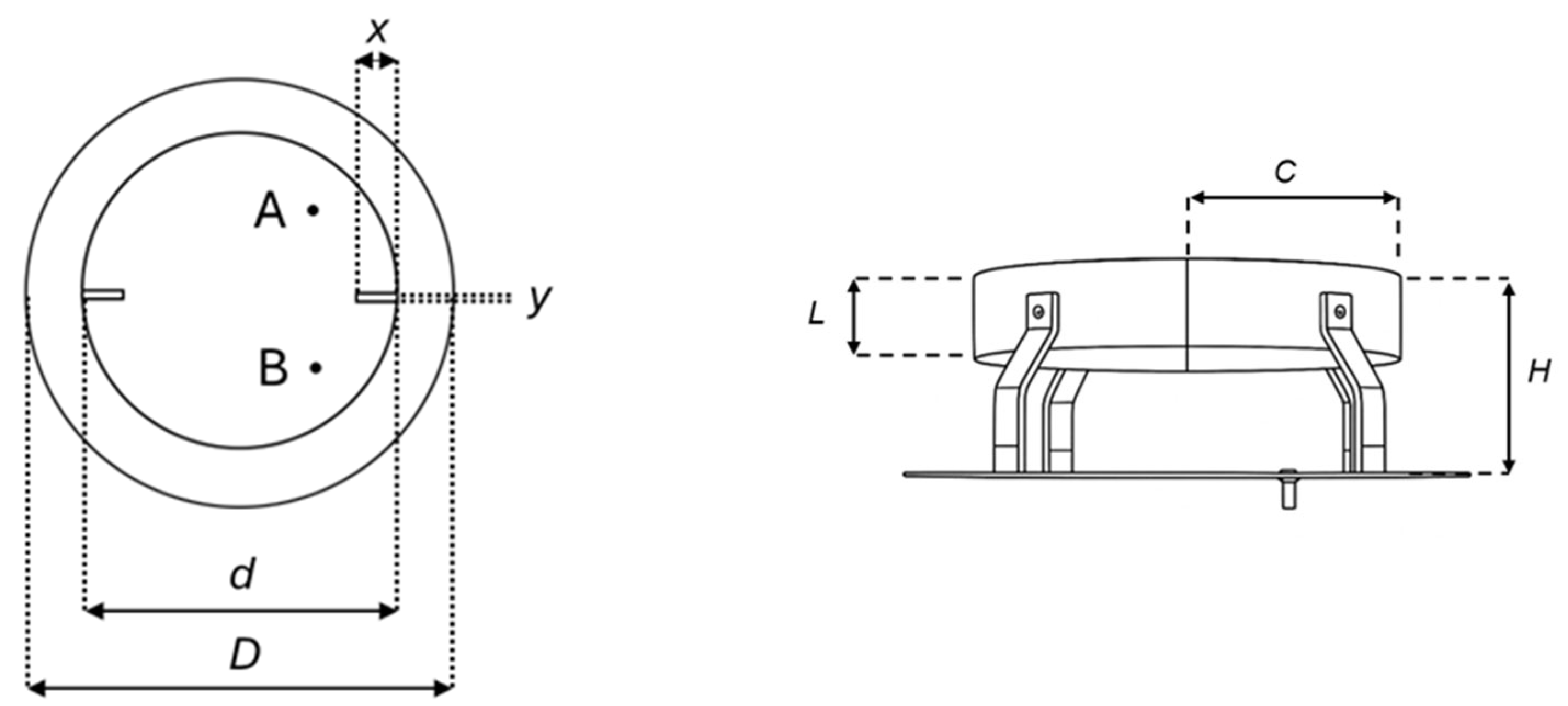 It is excited by two coaxial probes positioned in planes inclined at 45° with respect to the principal axes and located 90 mm from the patch center. The slot geometry, together with the placement of the coaxial feeding points, is optimized to excite two orthogonal modes in quadrature, thereby enabling the generation of Circularly Polarized (CP) radiation. The presence of two independent feeding points also enables dual circular polarization; as illustrated in