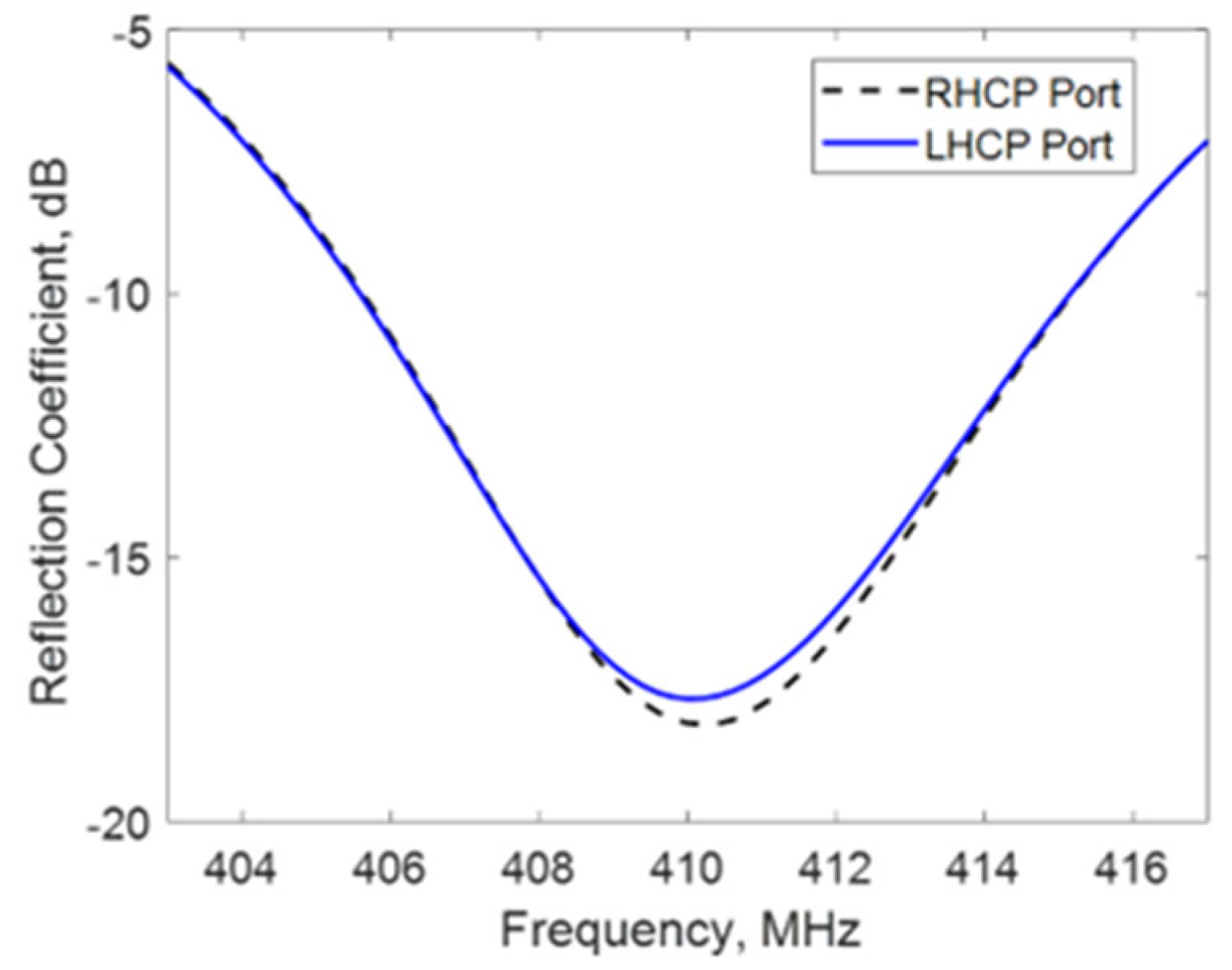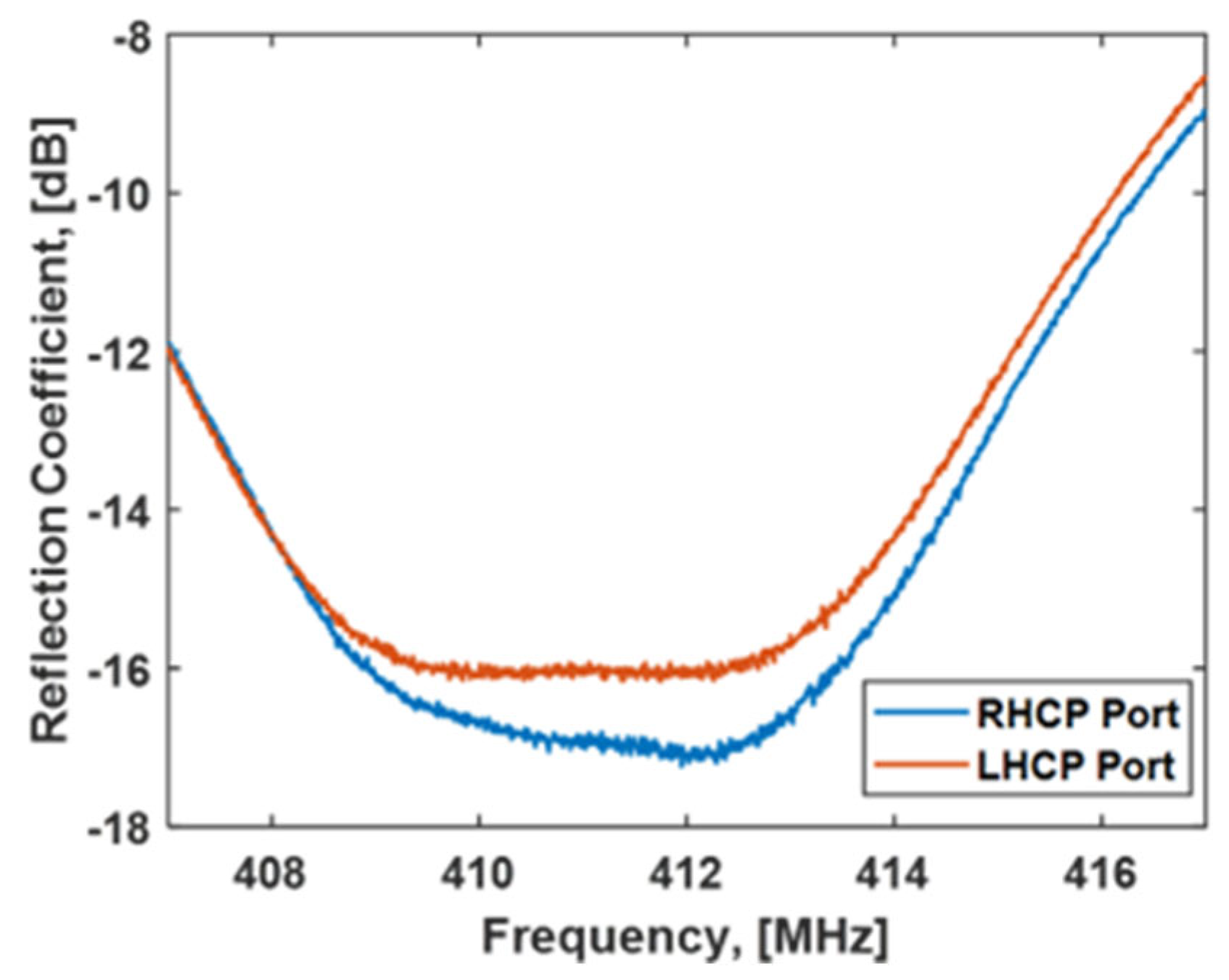 Figure 4, exhibits a magnitude below −10 dB over a 10 MHz bandwidth centered at 412 MHz. Measurement results are provided for both ports, corresponding to RHCP and LHCP excitations.