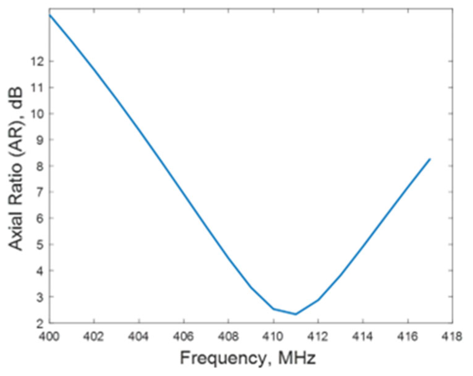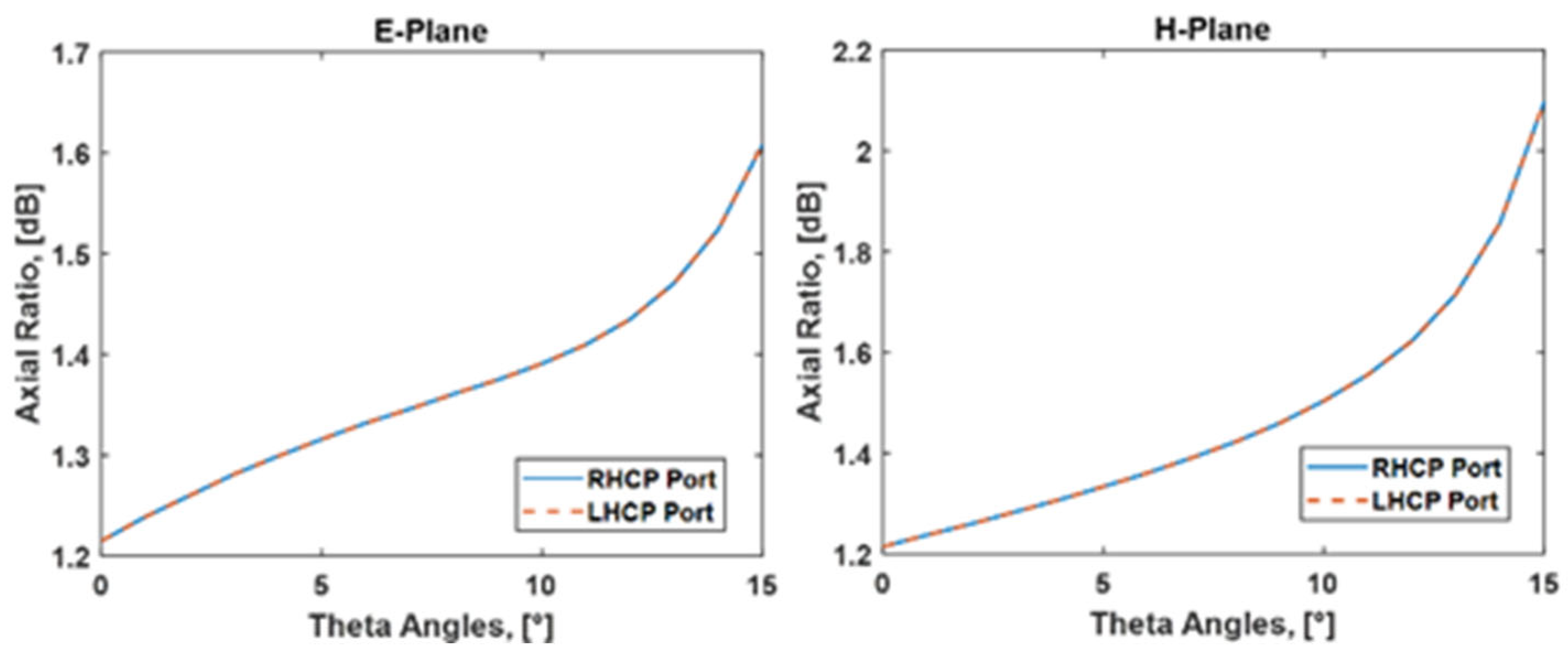 Figure 14 presents the simulated AR of the proposed antenna array at the frequency of 412 MHz in both the φ = 0° (E plane) and φ = 90° (H plane) cuts, showing values consistently below 3 dB across the entire main beamwidth.