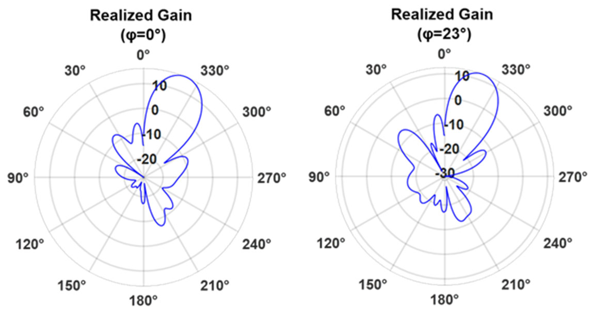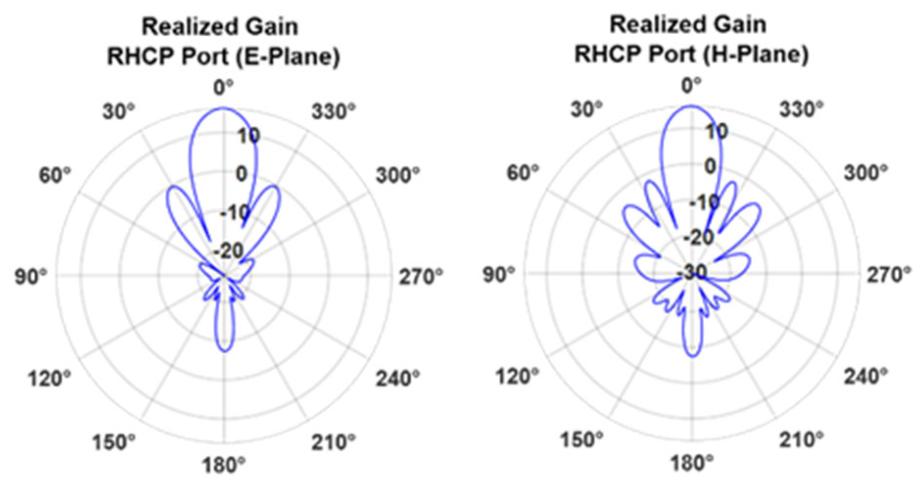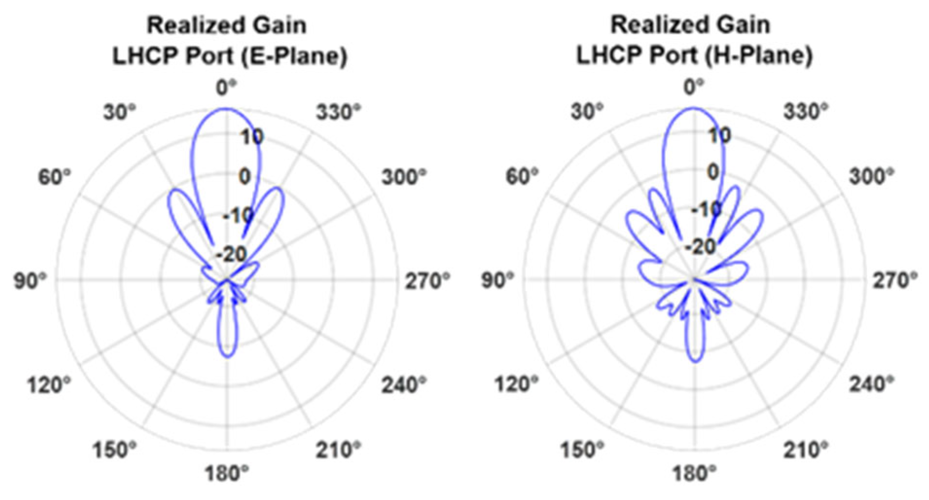 Figure 7, which present the realized gain for both RHCP and LHCP ports, in both principal planes. The HPBW is equal to 75°, while the measured SLL is approximately −10 dB in both cases.