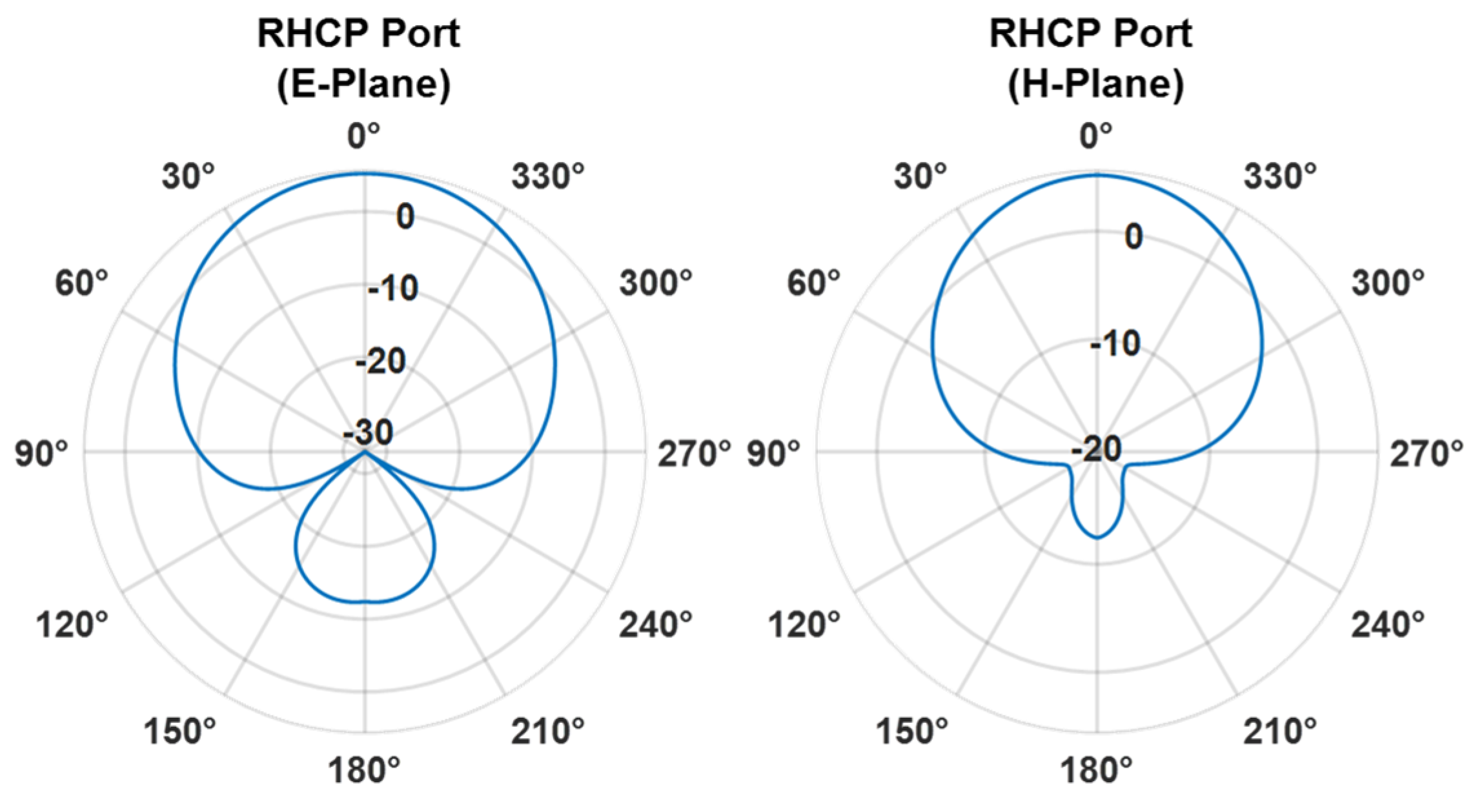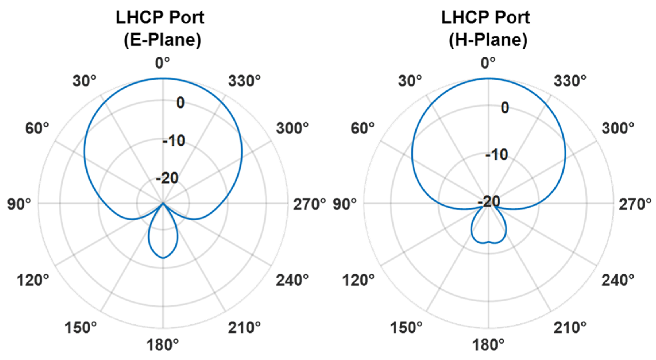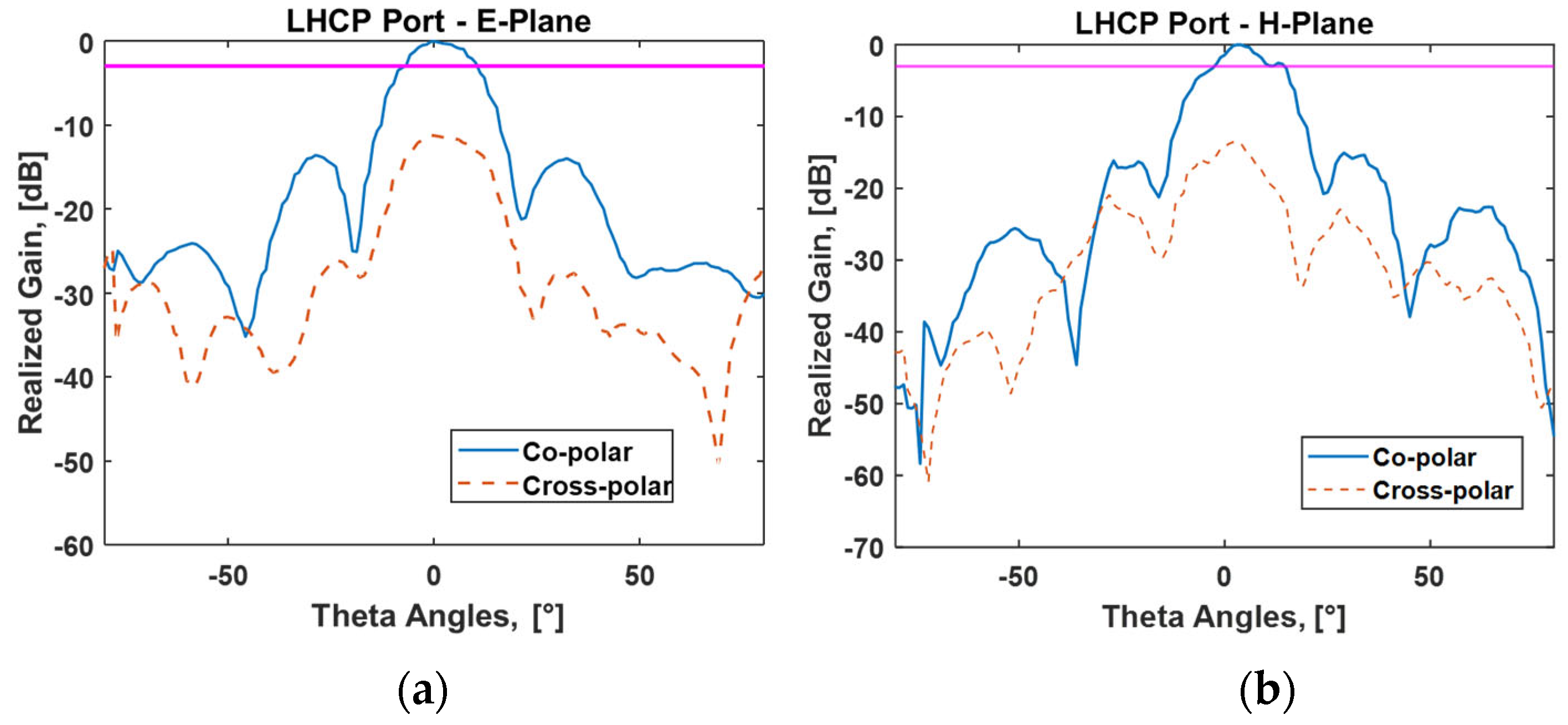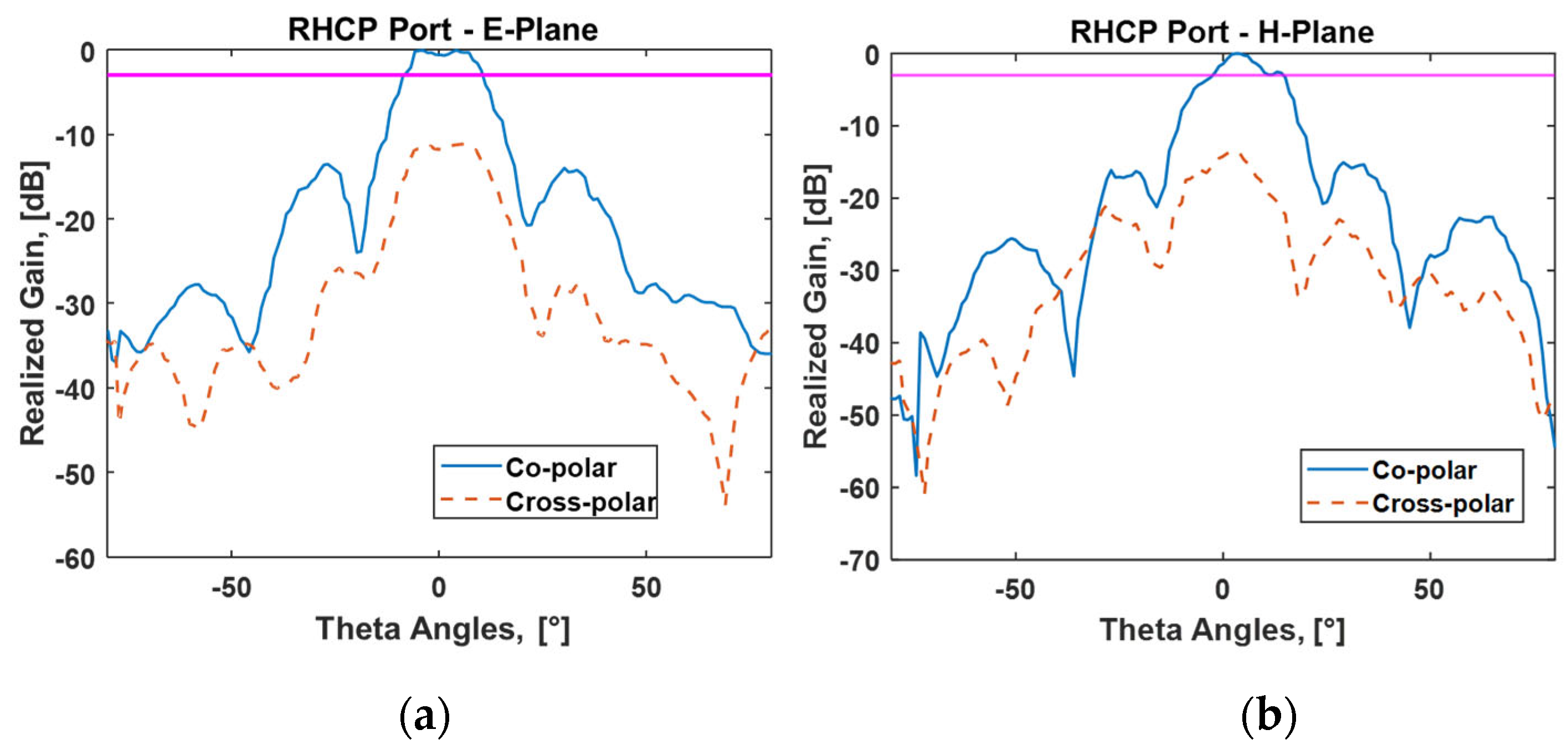 Figure 7, which present the realized gain for both RHCP and LHCP ports, in both principal planes. The HPBW is equal to 75°, while the measured SLL is approximately −10 dB in both cases.