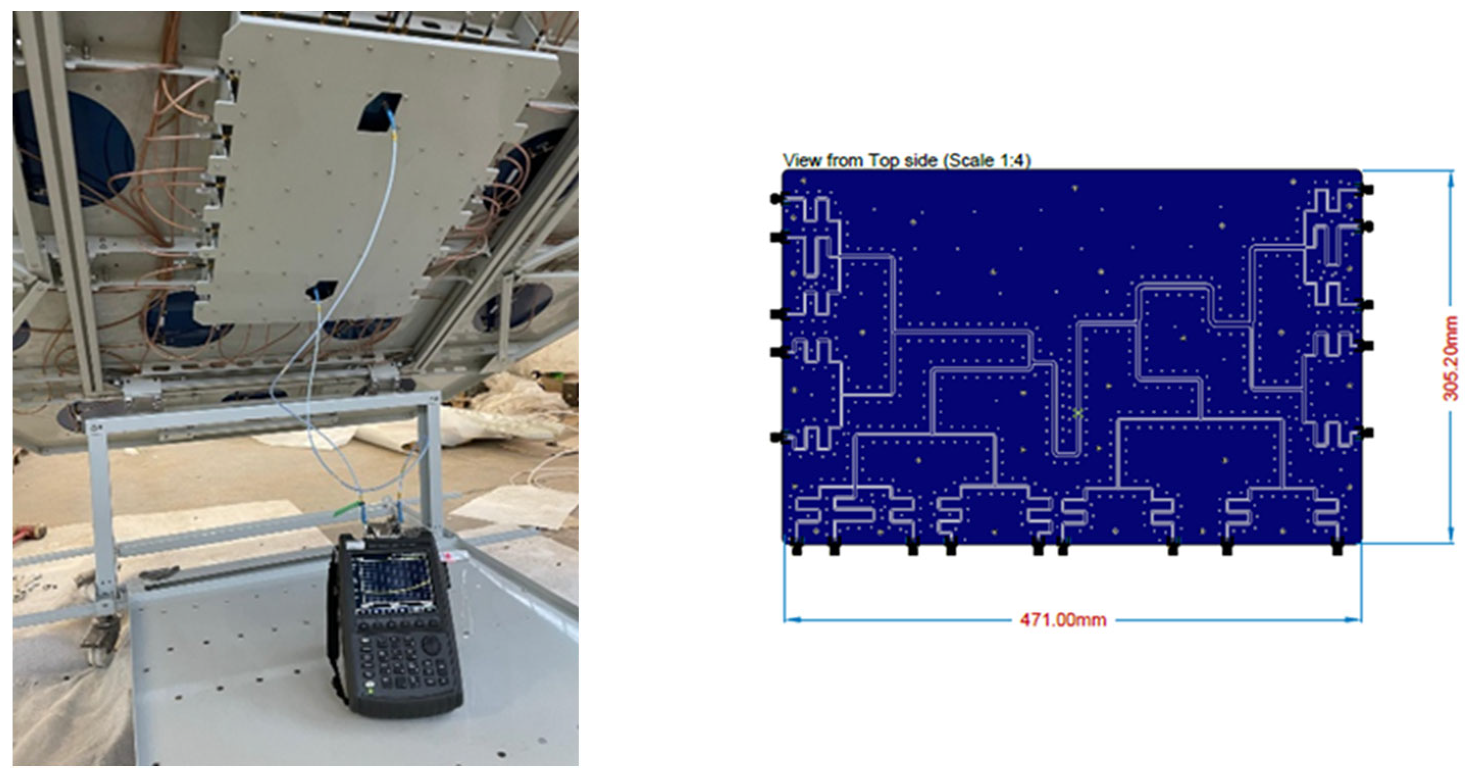 The SA comprises 19 radiating elements, each featuring two RF connectors, one for each polarization. The connectors are directly routed to two separate beamforming boards located beneath the ground plane: one dedicated to RHCP, the other to LHCP. The overall dimensions of a single feeding network are approximately 470 mm per 300 mm.