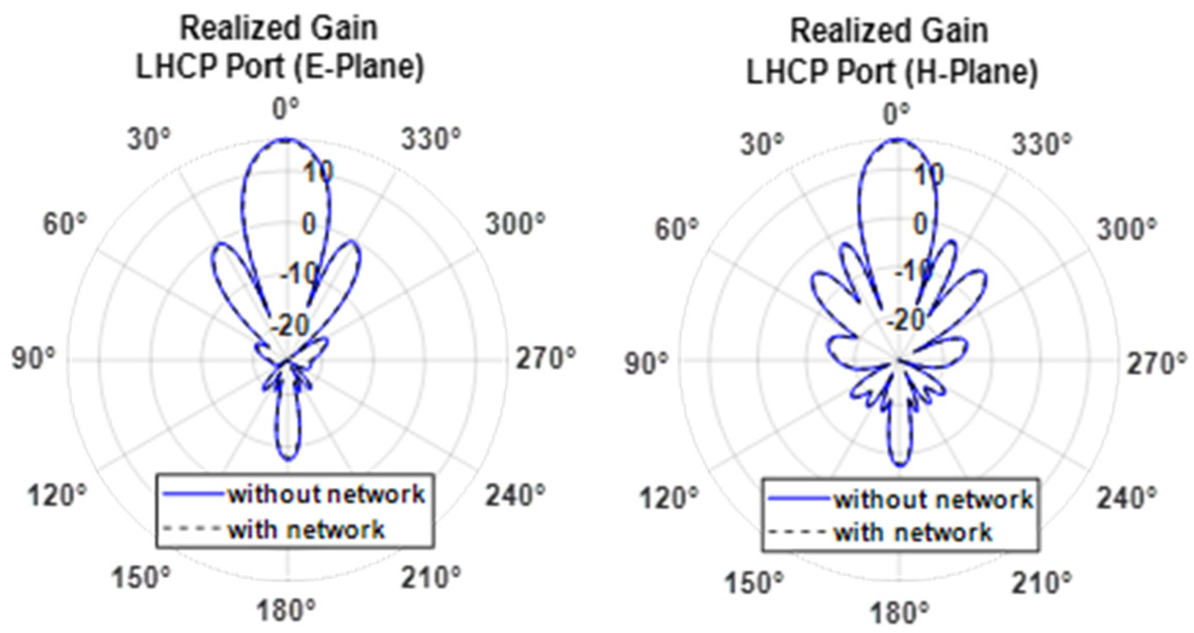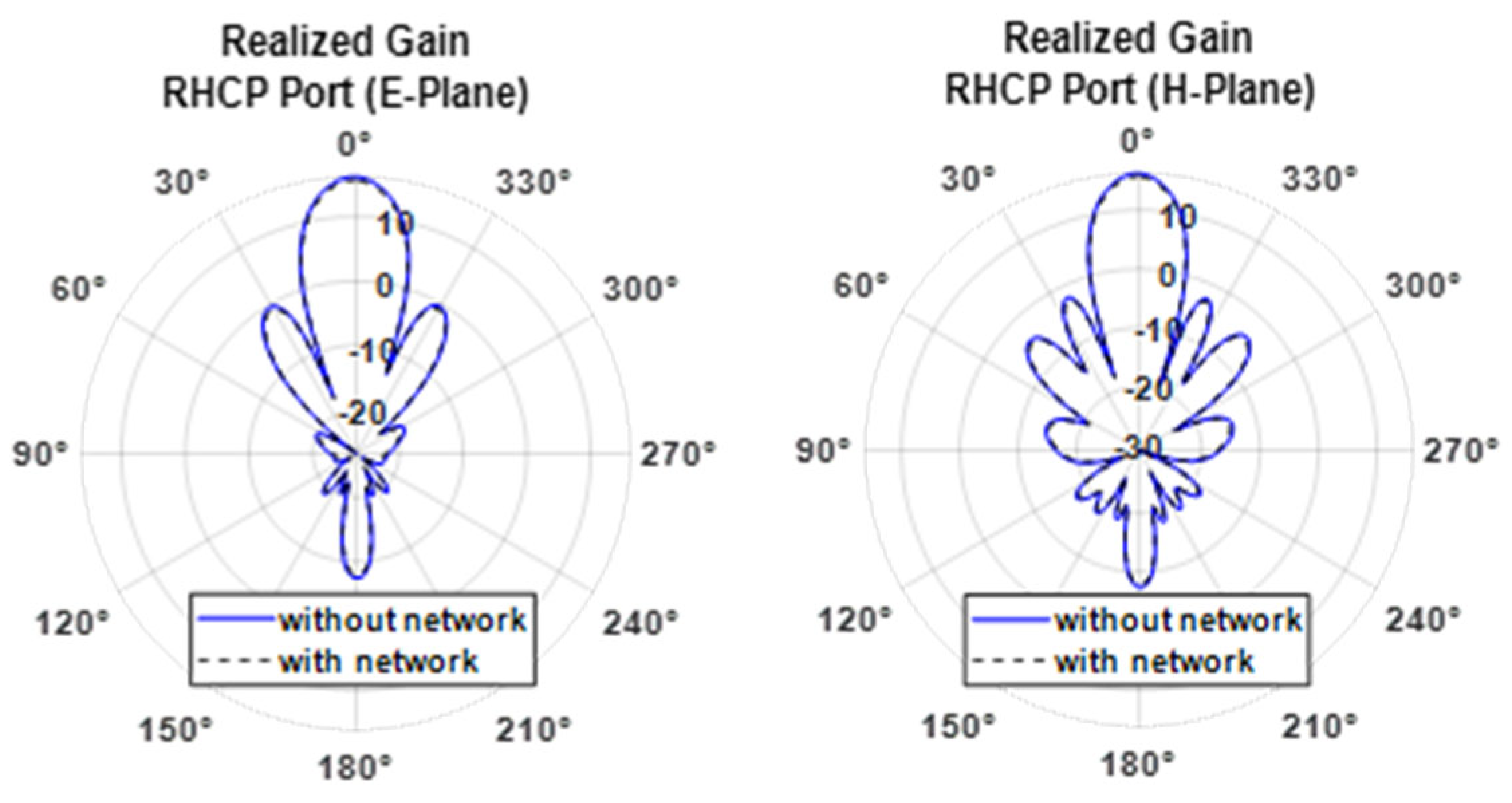 Figure 16 compare the realized gain across both the RHCP and LHCP ports and E and H planes, revealing a slight reduction in realized gain of approximately 0.5 dBi due to the presence of the feeding networks.