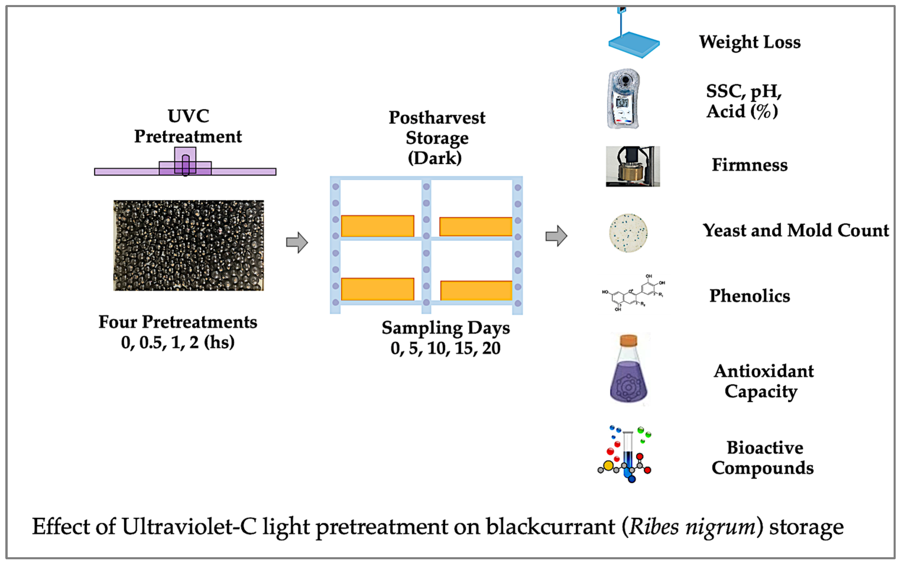 Wang, Z.; Svyantek, A.; Miller, Z.; Davis, H.; Kapus, A. The Influence of Ultraviolet-C Light Pretreatment on Blackcurrant (Ribes nigrum) Quality During Storage. Appl. Sci. 2025, 15, 8452. https://doi.org/10.3390/app15158452