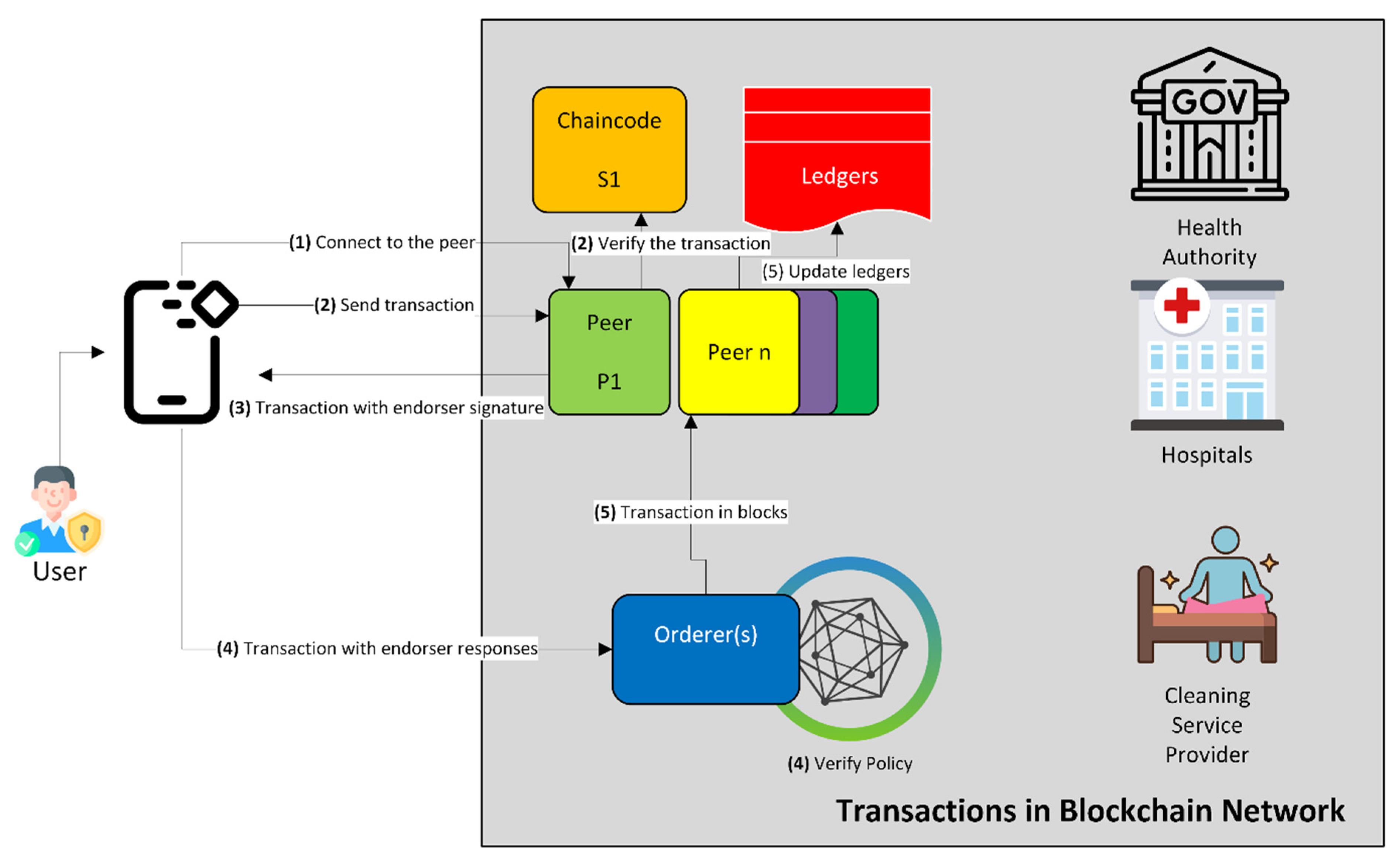 This section explains how transactions are executed among stakeholders using the “execute–order–validate” mechanism of Hyperledger Fabric, which ensures both traceability and trust in distributed environments. The proposed Hyperledger Fabric-based system continuously records and stores all activities and events related to the transaction in the immutable ledger of the blockchain. First, all participants must identify and authenticate their identities using digital certificates and cryptographic functions through MSP. The MSP component handles identity management and permission control for all actors in the network. All stakeholders are registered and identified by the health authority in the peer-to-peer blockchain network. When user registrations such as patients, cleaning teams, hygiene teams, etc., are made, each is assigned a chaincode address and ready to perform transactions on the network.