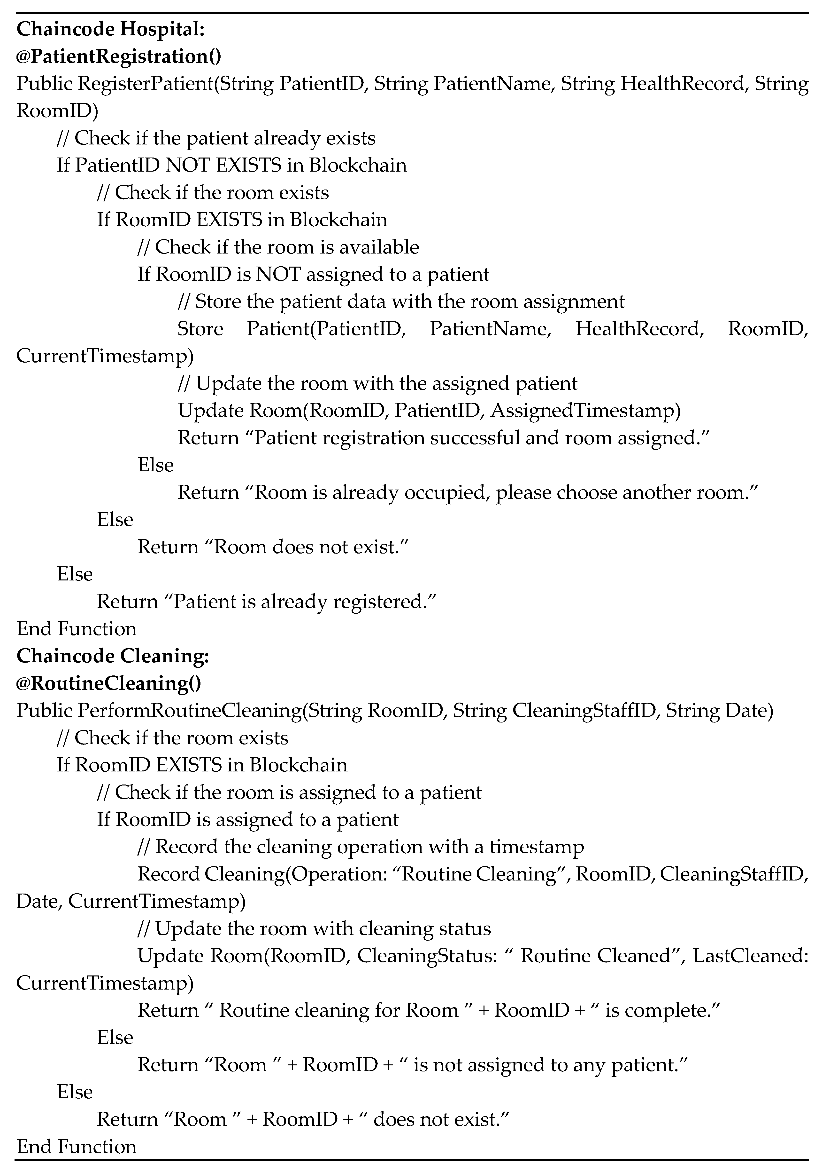 Figure 3 illustrates two core chaincode functions in pseudocode format, representing typical interactions such as patient registration and routine room cleaning.