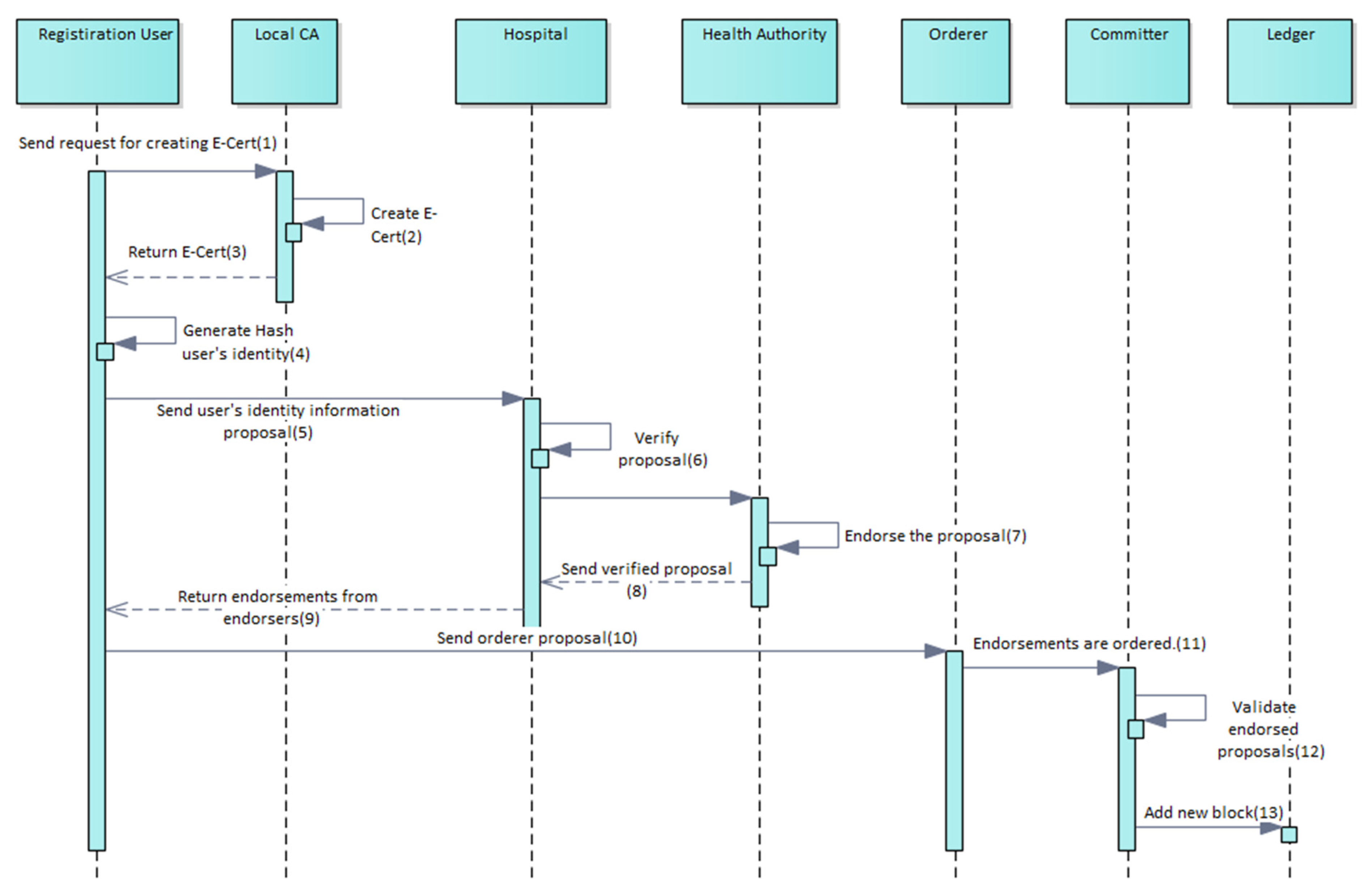 Figure 4 illustrates how patients are registered in a blockchain-based system in healthcare services and how this process is securely executed. The patient registration process begins with the creation of the patient’s identity information, health status, and room allocation details. When a new patient is added to the system, a unique identifier is generated for the patient, and an electronic certificate (E-Cert) is requested. This certificate is issued by a local certification authority (Local CA) integrated into the blockchain network and assigned to the patient. Once the certificate is created, the patient registration verification process is initiated by the hospital’s endorser nodes. In this process, the patient’s information is transmitted to designated endorser nodes according to the blockchain’s endorsement policy and undergoes a verification process.