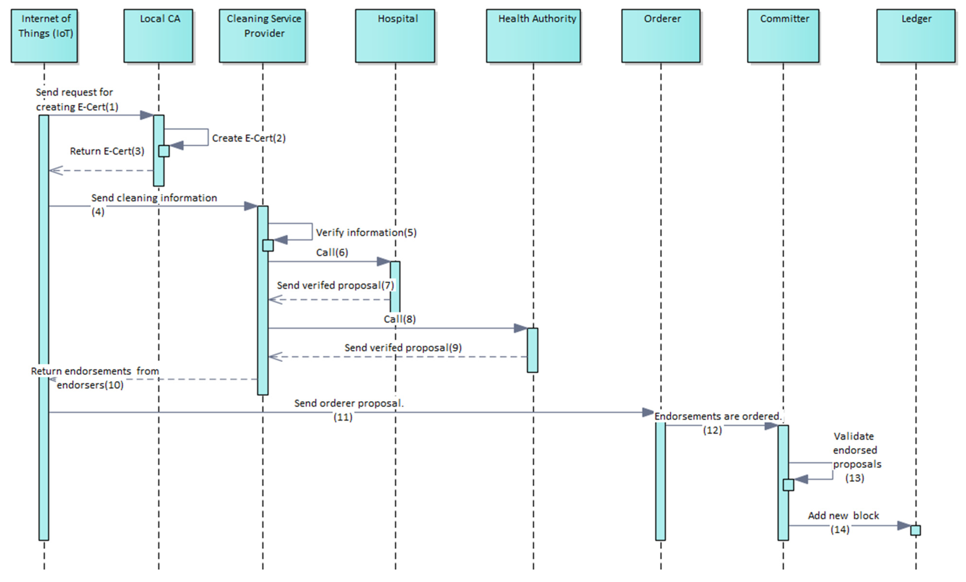 Figure 4 shows the sequence diagram provides a comprehensive overview of the blockchain processes involved. Furthermore, the routine cleaning operations, governed by a specialized chaincode, ensure that patient rooms are cleaned in a consistent, transparent, and reliable manner. All cleaning requests and routine cleaning activities are timestamped and securely stored on the blockchain, ensuring data integrity and traceability.