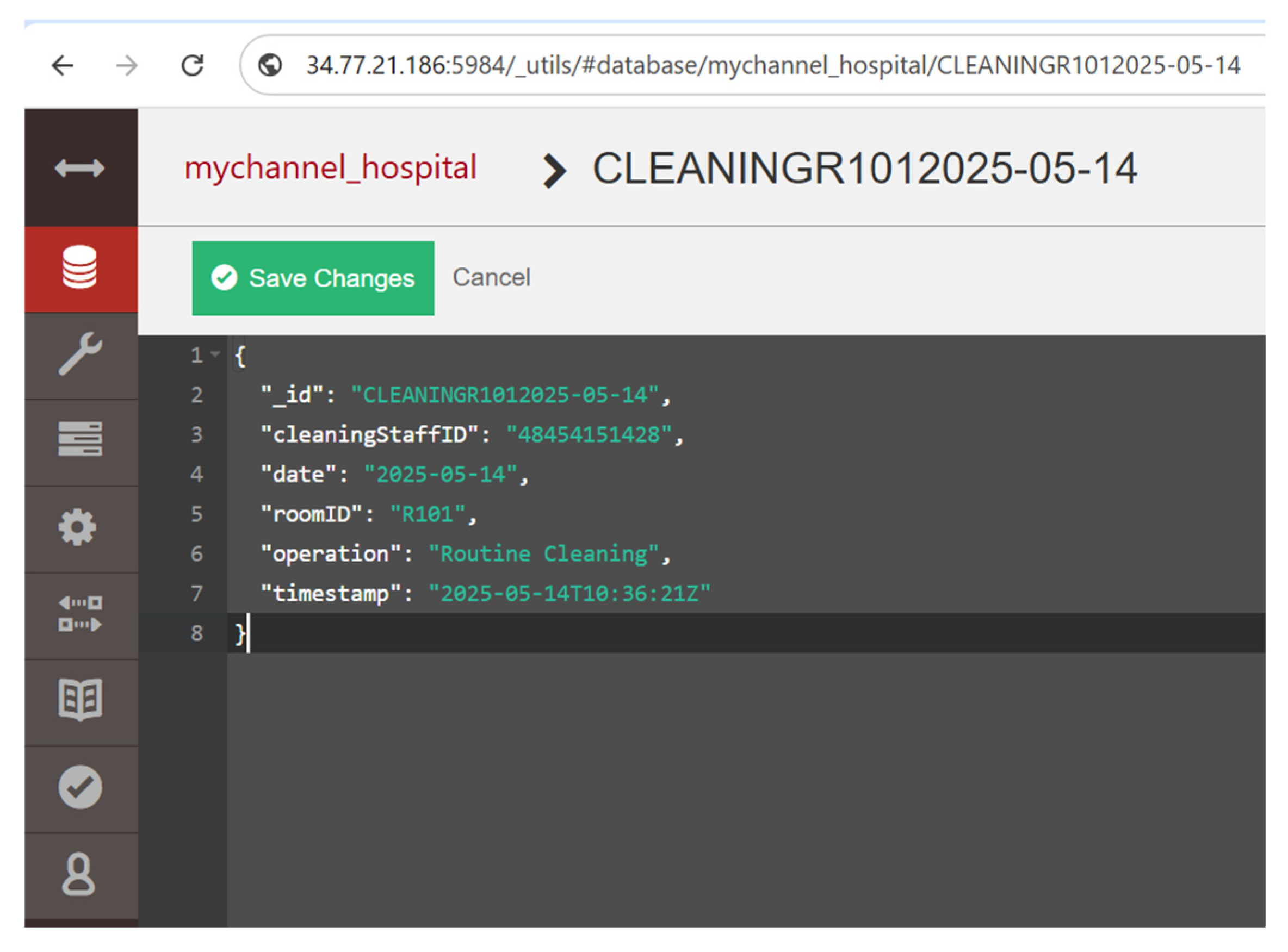 Figure 6 illustrates an actual cleaning event document stored in the CouchDB database. In this example, the event was recorded by a staff member named Semra for Room R101 on 14 May 2025. The chaincode appends a system-generated timestamp at the moment of execution, thereby enabling verifiable chronological ordering of cleaning events.