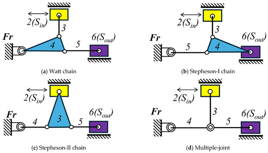 To address the mold clamping requirements in injection molding machines, several mechanism configurations have been developed and implemented. Figure 1 illustrates the four primary feasible mechanisms for mold clamping applications using generalized chain (6, 7) configurations: (a) Watt-chain mechanism, (b) Stephenson-I chain mechanism, (c) Stephenson-II chain mechanism, and (d) multiple-joint mechanism. These mechanisms represent the main structural alternatives available for achieving double-toggle effects in clamping applications.