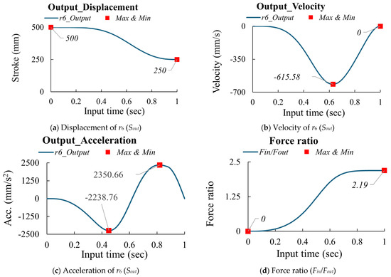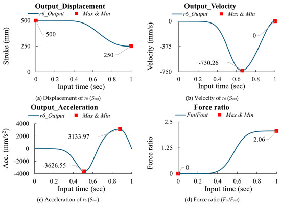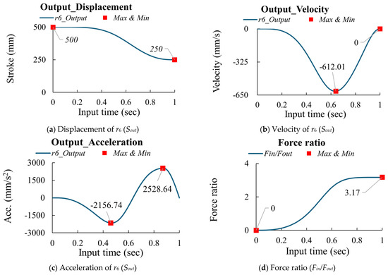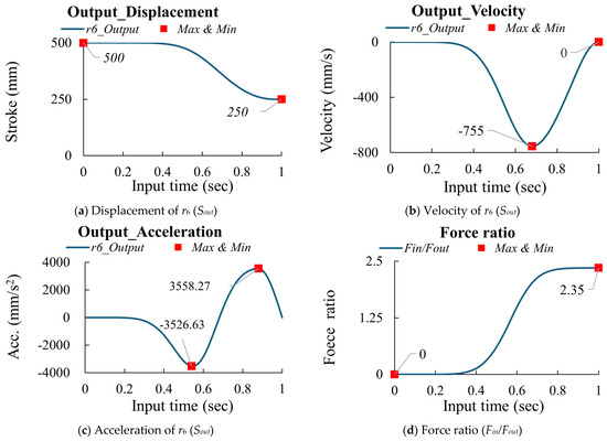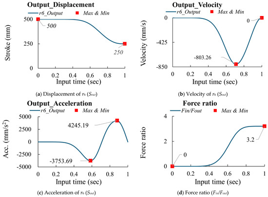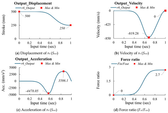 According to research [14,15,16] and based on Equations (3)–(6), if the design parameters are as shown in Table 1 and the input (Sin = 242.25 mm) is driven in 1 s with an MS curve, the output (Sout) displacement is 250 mm, as shown in Figure 3a. Then, the velocity and acceleration can be calculated using the finite difference method, as shown in Figure 3b,c. According to Equation (7) and Figure 3b, the force ratio is calculated and shown in Figure 3d. The peak values for the multi-joint mechanism are summarized in Table 2.