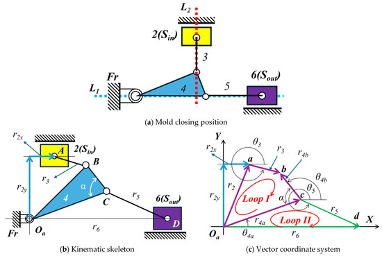 Figure 1d shows a multiple-joint mechanism from patent [1], while Figure 2 shows the corresponding mechanism and kinematic skeleton in both the closed and open positions. The mold closing position features double-toggle effects (L1 and L2), as shown in Figure 2a.