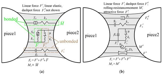 Schematic diagram of contact constitutive model (two-dimensional space). (a) Linear contact bond model. (b) Adhesive rolling resistance linear model.