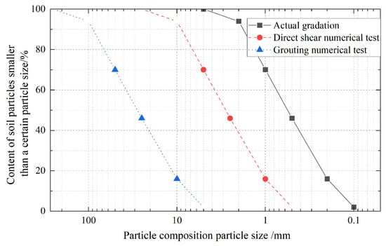 The particle size distribution of the overburden simulated by particle flow in this paper refers to the typical particle size of a grouting project. The corresponding gradation curve is presented in Figure 2. Based on the particle size range above, a program was developed using the Fish language function ball distribute bin to generate overburden particles following the specified gradation. The basic physical and mechanical properties of the simulated overburden are listed in Table 1.