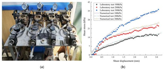 As an effective and straightforward method for analyzing the strength of overburden, the direct shear test offers a clear mechanical basis and high testing efficiency. The ZJ1 strain–controlled direct shear apparatus is used in this laboratory test. Vertical pressures of 100, 200, and 300 kPa are applied, and the shear rate is set to 0.8 mm/min []. The test apparatus is shown in Figure 4a. In the numerical direct shear test, a shear box model was constructed at a 1:1 scale based on the actual apparatus dimensions. To reduce computational cost and reference existing research, the particle sizes were scaled up by a factor of five to 0.005, 0.0025, and 0.001 m, respectively. A total of 1207 particles were generated in each shear box, and the overburden particles followed the contact bond model. The shear stress–displacement curve used for calibration is shown in Figure 4b.