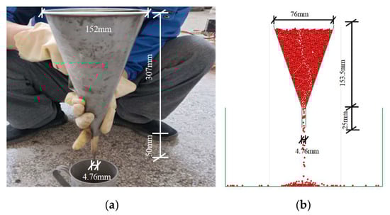 The Marsh funnel test is a simple, rapid, and practical field method primarily used to evaluate the relative viscosity of non-Newtonian fluids, such as cement slurries or other grouting materials. It offers a standardized and reproducible approach for assessing the flowability and consistency of slurry mixtures, serving as a useful indicator of their workability under field conditions. As a classical rheological test method, the Marsh funnel test quantitatively evaluates the workability of slurry by measuring its outflow time through a standardized geometric container. In this study, a stable slurry with a water–cement ratio of 0.7 is used, and its component mass ratio is cement–water–water reducer–bentonite = 1:0.7:0.015:0.005. The water exudation rate within 2 h is measured to be ≤1% in laboratory tests. To improve computational efficiency, the following optimization strategies are employed in the numerical modeling: (1) Geometric similarity criterion: key dimensions of the standard funnel are reproduced at a 1:2 scale. (2) Particle discretization: the characteristic particle size of cement particles is set to 1 mm, and 1341 discrete elements are generated using a random packing algorithm. (3) Contact constitutive modeling: the adhesive rolling resistance linear model is adopted to characterize particle interactions. (4) Parameter inversion and calibration: through iterative optimization of mesoscopic parameters, the simulated outflow time converges to the reference value of 45 s obtained from physical testing. The key geometrical parameters of the Marsh funnel are illustrated in Figure 5a,b.