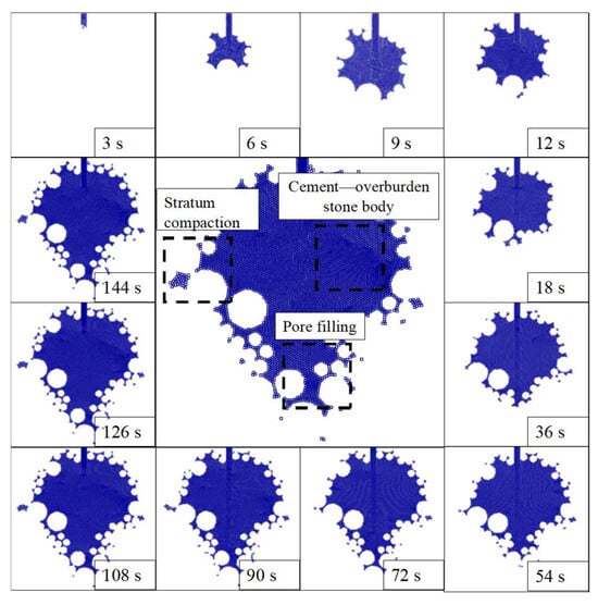 The grouting duration is set to 144 s (i.e., 2.4 min), corresponding to the time required for all slurry particles to be discharged from the grouting pipe under a maximum pressure of 3 MPa, as determined in preliminary experiments. The slurry inlet pressure is 2 MPa, the model boundary pressure is set to 0.5 MPa, and the numerical model and parameter selection follow Section 3.1 and Table 2. The discrete element simulation results of slurry diffusion are presented in Figure 6. As shown in the figure, (1) in the initial stage of grouting, the slurry enters the formation along the pipeline under grouting pressure, then diffuses radially outward from the grouting hole into the overburden, forming an approximately pear-shaped diffusion pattern. (2) The reinforcement effect of the grout is comprehensive. Initially, the slurry enters the formation through compaction and diffusion. As grouting continues, it gradually overcomes the bonding forces between overburden particles, leading to a splitting diffusion pattern. Subsequently, the slurry seeps through the created fissures, enveloping some overburden particles and forming a slurry–soil mixture.