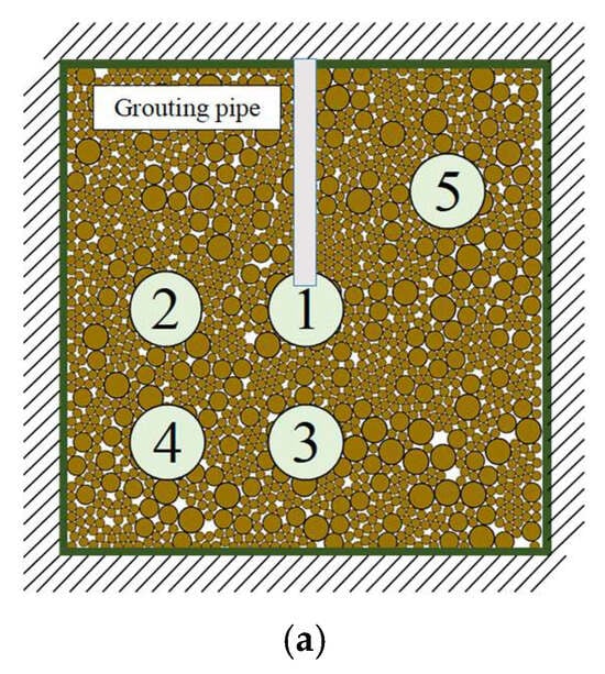 In the numerical grouting model, the d65, d50, and d35 particle sizes of the actual formation (corresponding to 1 mm, 0.5 mm, and 0.2 mm, respectively) are selected and uniformly magnified by a factor of 50, resulting in simulation particle sizes of 50 mm, 25 mm, and 10 mm for the overburden. Due to their small size and large quantity, cement particles present a major computational constraint in discrete element simulations, limiting both scale and efficiency. To ensure slurry fluidity during the grouting simulation, the groutability ratio is set to be greater than 10, meaning the cement particle size is defined as 1 mm. In the simulation, slurry is introduced into the overburden from top to bottom through a grouting pipe. The boundary conditions are defined as follows: the model dimensions are set to 1.0 × 1.0 m; a pressure boundary is applied along the model’s perimeter; the confining pressure P0 of the overburden is set at 500 kPa; and this pressure is applied to the walls using a servo mechanism. The boundary configuration of the grouting simulation model is illustrated in Figure 3b.