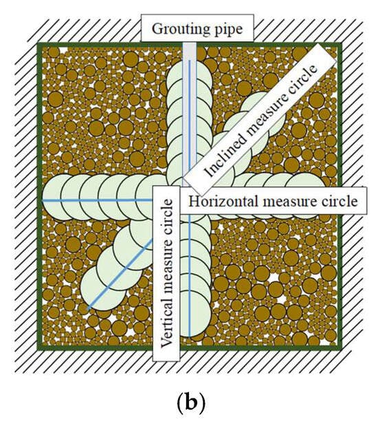 This section aims to monitor post-grouting changes in porosity and coordination number along the horizontal, vertical, and inclined directions. The grouting hole is defined as the coordinate origin, with the horizontal right direction as the positive X-axis and the vertical upward direction as the positive Y-axis. Measurement circles along the horizontal and vertical directions are spaced at 0.05 m intervals, with 13 measurement points arranged on each side of the origin. Along the inclined direction—set at 45° relative to the positive X-axis and centered at the origin—measurement circles are spaced at 0.07 m intervals. A total of nine measurement circles are arranged from the bottom left to the top right along this inclined direction. The overall layout of the measurement circles is illustrated in Figure 7b.