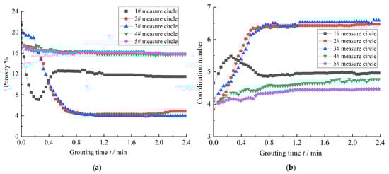Monitoring results of particle contact law during grouting. (a) Distribution law of particle porosity during grouting. (b) Distribution law of particle coordination number during grouting.