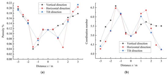 The coordination number distribution is shown in Figure 9b. As the distance from the grouting hole increases, the coordination number in both the horizontal and inclined directions first increases and then decreases, exhibiting approximate symmetry about the origin. The coordination number ranges from 4.2 to 6.5. However, along the positive vertical axis, the coordination number initially increases and then stabilizes. This behavior occurs because the slurry enters the grouting hole from top to bottom via the grouting pipe. As a result, the monitoring zone above the grouting hole captures the state of cement particles within the pipe, which does not accurately reflect the reinforcement characteristics of the overburden. Affected by the random and uneven distribution of particles on the coverage side, the porosity curve and the coordination number distribution curve are not completely symmetrical with the horizontal axis zero point. Specifically, the coordination number on the left side of the grouting hole is slightly higher than on the right, and the lower-left side exhibits higher values than the upper-right side—indicating a stronger reinforcement effect in the lower-left region compared to the upper-right.