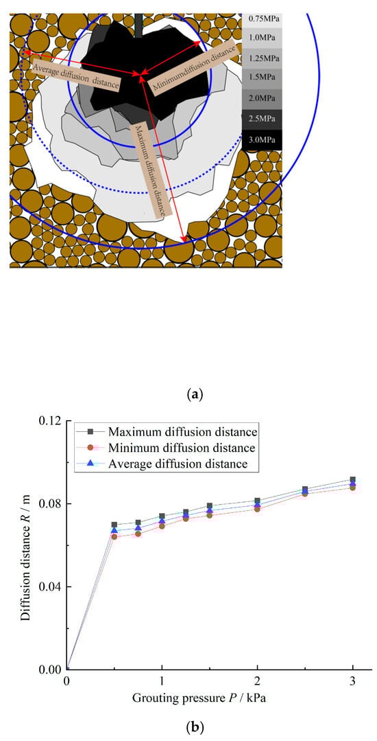 Based on the discrete element simulation results, the extent of slurry diffusion is outlined in Figure 10a, and the corresponding diffusion distances are plotted in Figure 10b. The analysis shows that with the increase of grouting pressure, the maximum and minimum diffusion distances show a trend of increasing rapidly and then increasing slowly, and the increasing trend of the diffusion radius of the whole slurry is nonlinear. For example, the maximum diffusion distances corresponding to grouting pressures of 500 kPa, 750 kPa, 1 MPa, 1.25 MPa, 1.5 MPa, 2 MPa, 2.5 MPa, and 3 MPa are 6.41, 6.55, 6.92, 7.28, 7.44, 7.74, 8.48, and 8.67 cm, respectively.