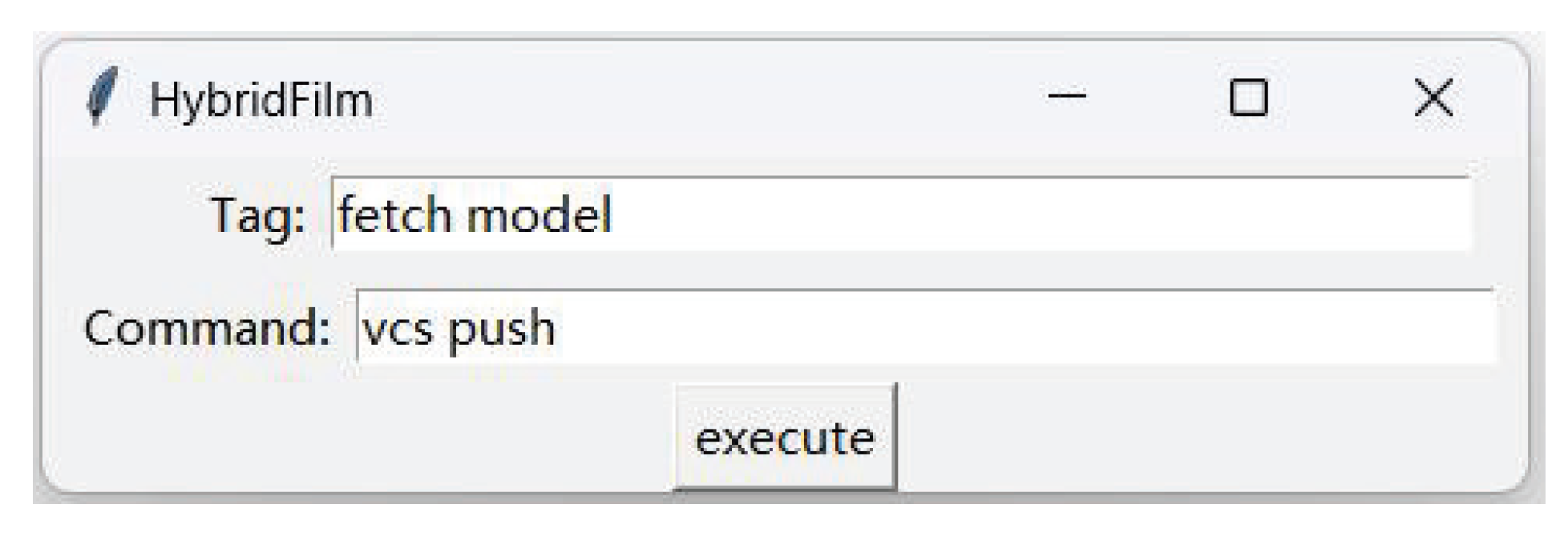 - Submitting: Interactions requiring detailed operations or text input have been shown to be more easily accomplished on the desktop [48]. To maintain operational consistency, we designed the submission interaction through the graphical interface on the desktop (Figure 7). First, the user fills in the Tag box with a textual prompt, then enters the command in the Command box to submit the scenario. The system then performs an automatic operation to generate a new node, which is appended to the DAG, switches the current node, and finally refreshes the visualization of the “film” in the immersive space. Additionally, the Command box supports the entry of other commands that are recognized by the system.