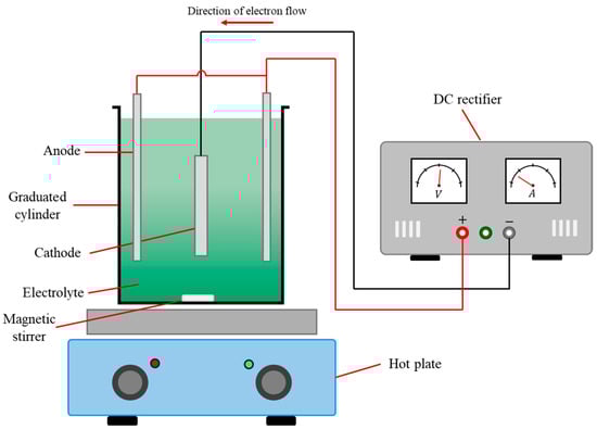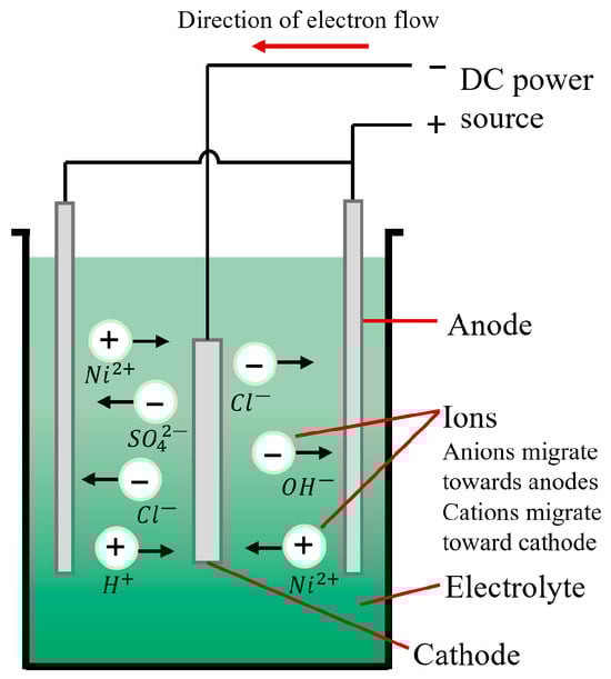 The setup for the electrodeposition of nickel involves four main components, as shown in Figure 1. These components include a source of direct electric current, usually provided by a DC rectifier, the positively charged electrode known as the cathode, and the negatively charged electrode known as the anode []. The cathode is the part that is to be deposited on, known as the substrate, and the anode is usually a suitable form of nickel metal to facilitate the deposition process by replacing depleted ions in the electrolyte []. The final component is the medium of ion supply and transport known as electrolyte. Most nickel electroplating is carried out in an aqueous bath containing dissolved metal salts (ions). These solutions are favorable for plating on polymers because they operate well below the glass transition temperature of most plastics, thus avoiding thermal distortion of the substrate. Aqueous baths are further subdivided by pH into acidic, neutral, and alkaline systems []; the acidic (Watts type) formulation remains the most prevalent because it is simple to prepare and easy to control, and consistently produces high quality nickel deposits.