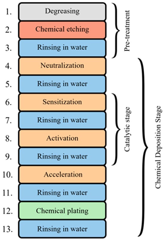 Electroless plating followed by electroplating is the most prolifically used PM technique []. Electroless deposition is a chemical process similar to electrodeposition but without the need for an external power source. Instead, the process relies on a redox reaction between a reducing agent in the plating solution and metal ions in the electrolyte []. This process is autocatalytic, meaning that once the initial layer of metal is deposited, it catalyzes further deposition []. Electroless deposition is a multistep, time consuming process []. The various steps involved in the electroless deposition are schematically shown in Figure 3. The pre-treatment creates a clean, pH-balanced surface so that later catalytic chemicals can infiltrate the surface uniformly. The catalytic stage deposits nanoscale “seeds” that start the autocatalytic reduction. The overall chemical deposition stage builds the final coating with a thickness controlled only by immersion and bath chemistry with no applied current [].