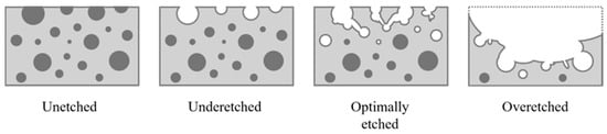 Another effect that must be considered is how common PM techniques, including electroless plating, modify the interface of the polymer (as the substrate) and the plated metal []. For example, as depicted in Figure 4, the etching process in electroless plating roughens the surface of the polymer to allow for the deposition of a primer metal, e.g., palladium, on the surface and, thus, to facilitate the autocatalytic process. It should be noted that for electrodeposition on 3D-printed polymers, PM techniques, such as electroless plating, alter the as-printed surface finish of the polymeric material and therefore roughen the interior surface of the plated metal if the polymer is removed. This roughening is desirable for some processes because it adds adhesive strength and encourages metal-polymer diffusion []. However, for other processes, such as deposition on mandrels, where the substrate is removed from the final part, smooth surface characteristics are desired. There have been advancements in electroless plating processes that do not require surface etching to initialize the plating process, but these methods usually require a polymer that is already premixed with another conductive element. These types of polymers are not easily printable and usually result in uneven conductivity due to inhomogeneous incorporation of metal ions [].