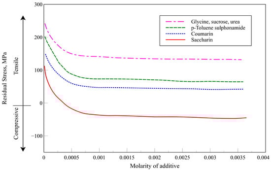 Organic additives must be carefully balanced to reduce the residual internal stress; in optimal amounts, they refine the grain structure and can lower the internal stress [,], yet in excess, they may exacerbate internal residual stress as seen in Figure 6. Saccharin can cause compressive stresses at concentrations greater than 0.00035 mol/L, while other additives such as coumarin induce residual tensile stress which increases sharply with concentrations less than 0.0005 mol/L []. Additionally, factors such as the current waveform and the geometry of the electrode setup—specifically the anode-to-cathode distance and surface area ratio—are critical in ensuring that nickel ions are replenished efficiently, thus avoiding conditions that might lead to high internal stresses [,].
