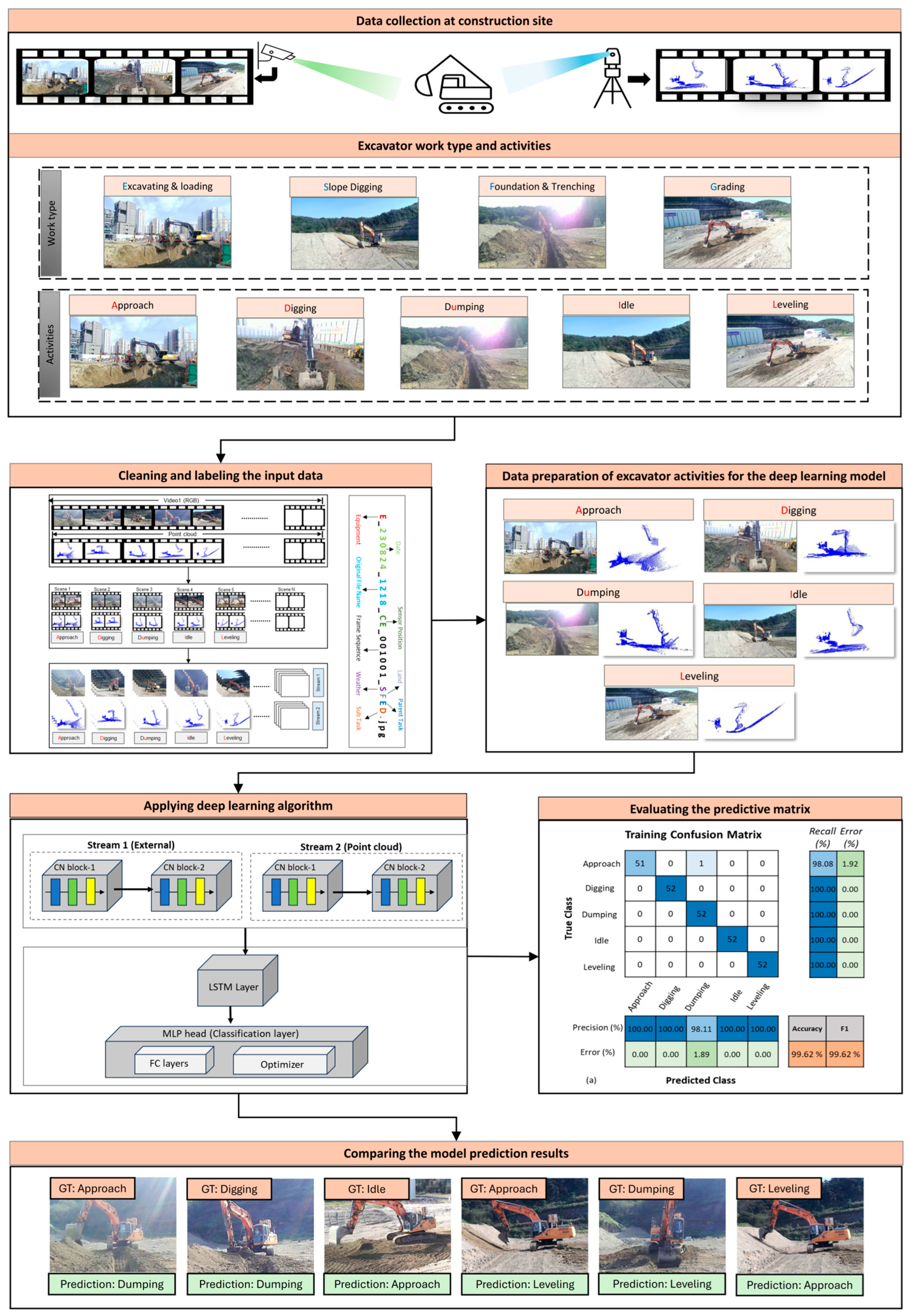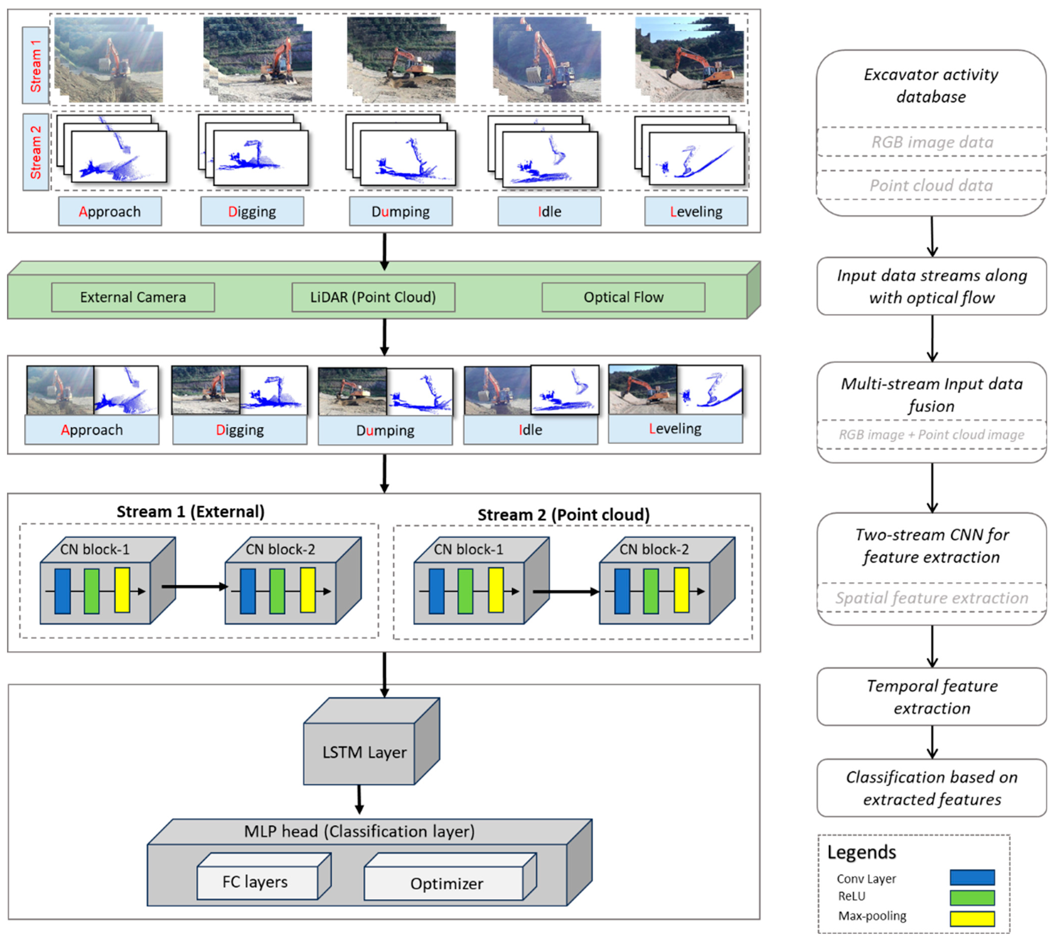 - A novel multi-stream input data-based methodology for excavators’ activity recognition using a two-stream CNN-LSTM DL algorithm.