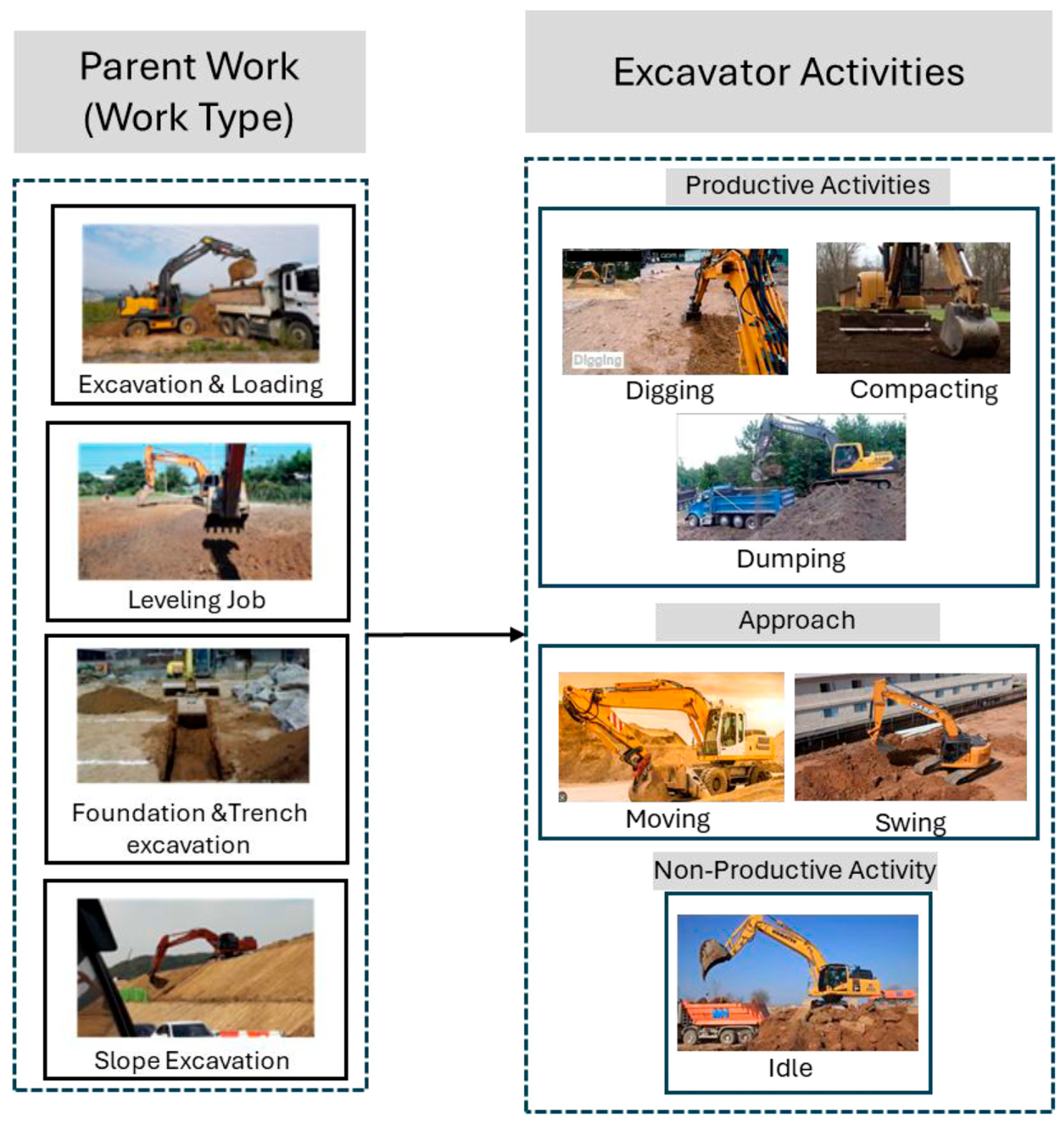 - Chen, C.; Zhu, Z.; Hammad, A.; Akbarzadeh, M. Automatic Identification of Idling Reasons in Excavation Operations Based on Excavator–Truck Relationships. J. Comput. Civ. Eng. 2021, 35. [Google Scholar] [CrossRef]