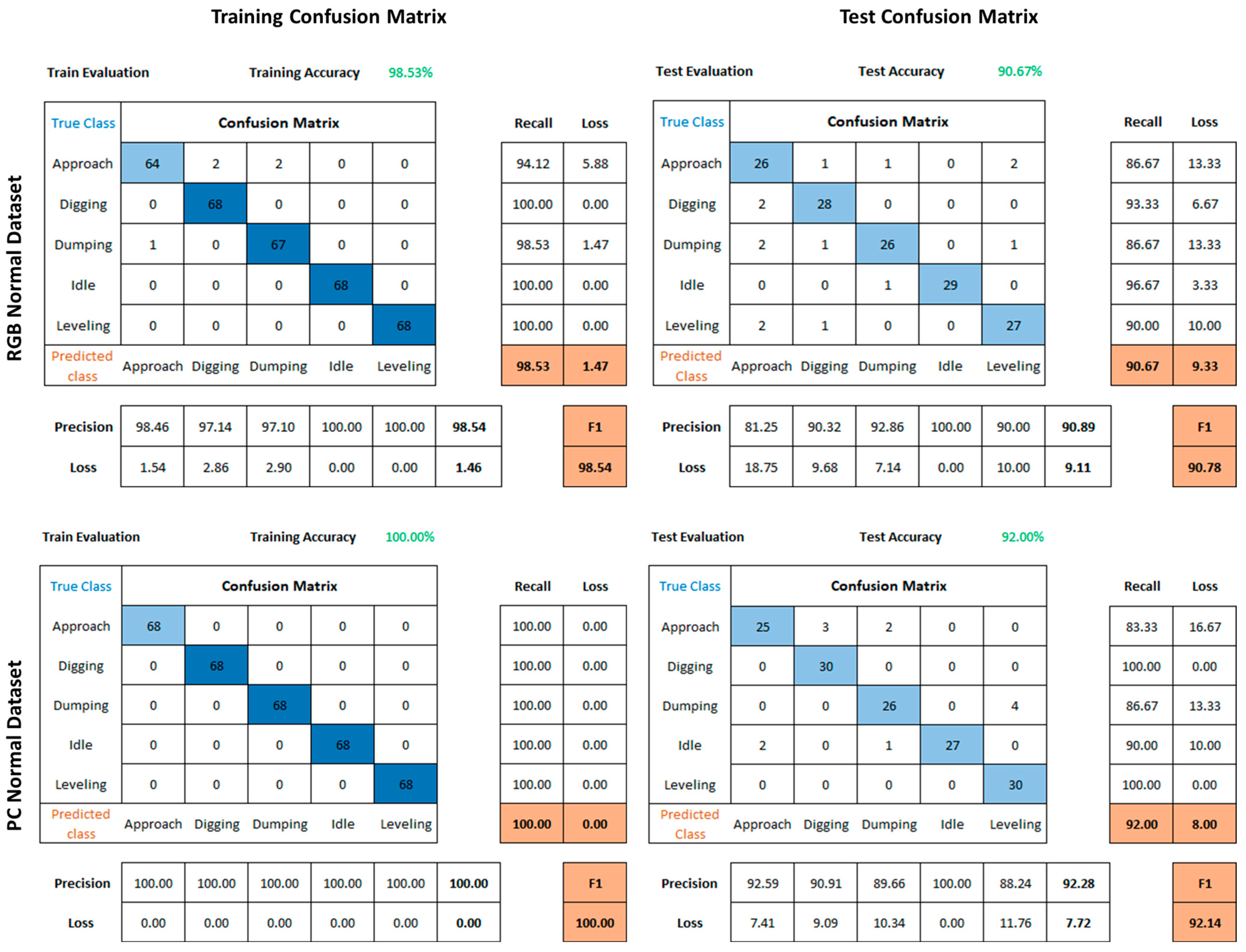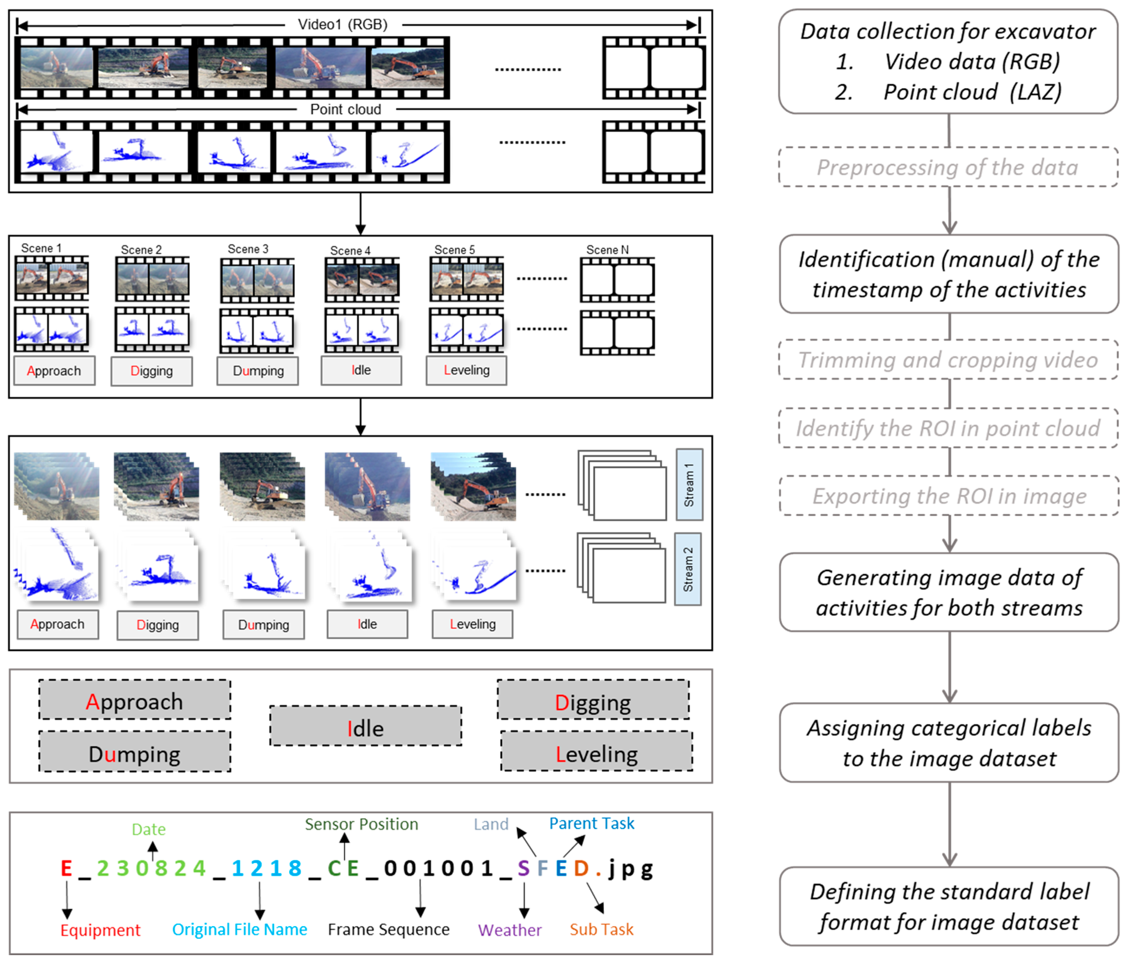 - A distinct dataset has been developed with two different input sources for excavator activities during the earthmoving process at various site conditions. A database containing 495,000 video frames of RGB external camera images and point cloud images from various construction sites with different conditions has been developed.