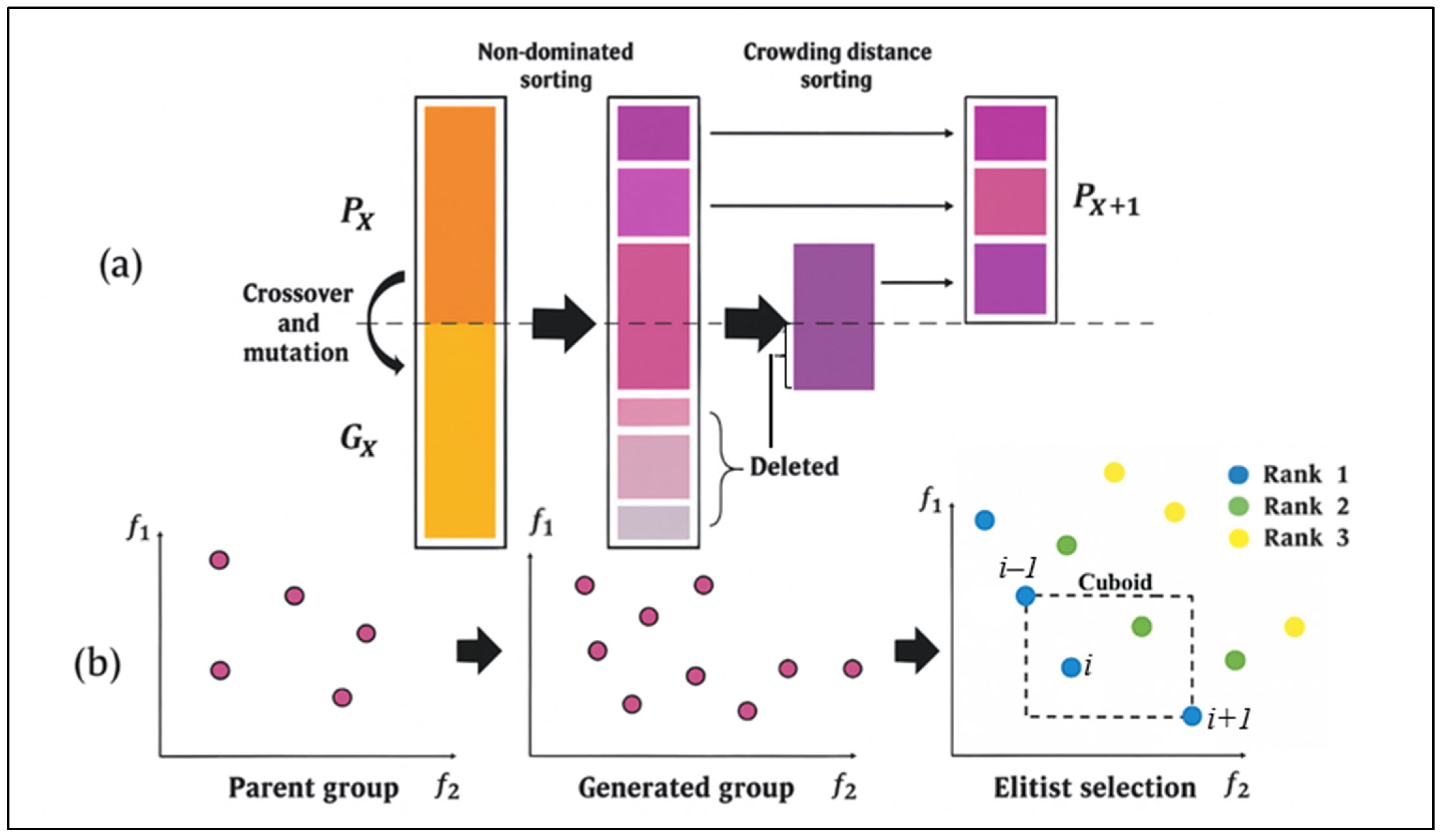 - Crowding distance calculation: Within each rank, individuals were assigned a crowding distance value based on their Manhattan distance to neighbors in objective space. This distance preserves solution diversity and prevents premature convergence.
