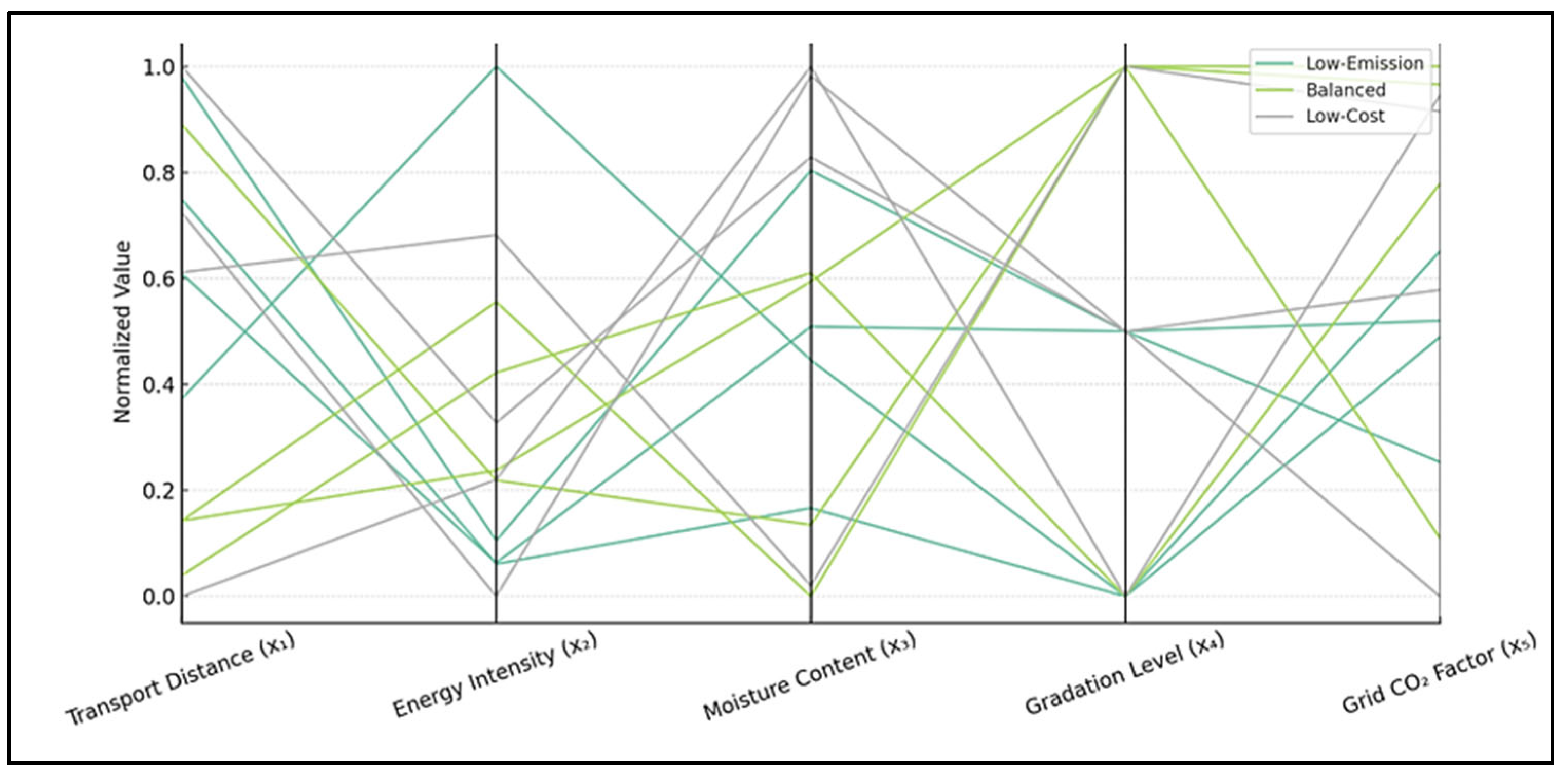- X1: Transport Distance (km)—10 levels ranging from 5 to 250 km, with a step size of 27.2 km.