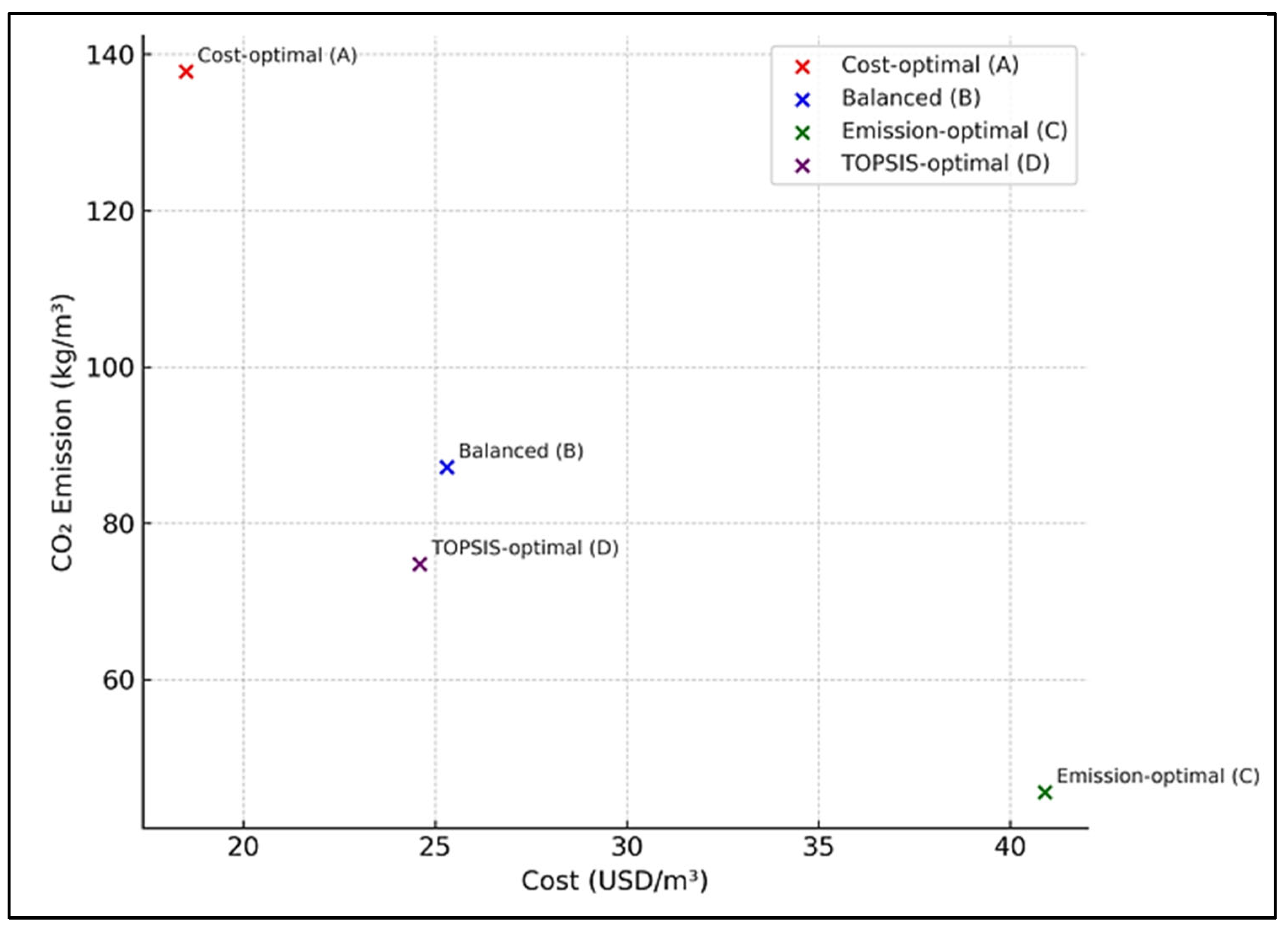 - : Distance of alternative i to the ideal solution (lower cost and emission),