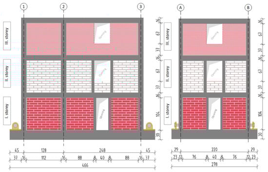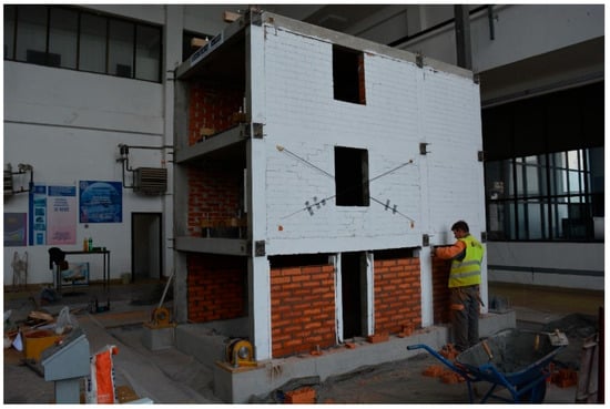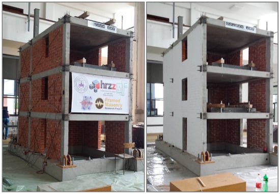 The referenced models are given in Figure 2. The height of the models was 3.9 m. Model 1 structure consisted of hollow-clay infill walls, while the Model 2 structure was composed of solid-clay infill walls. The total weight of Model 1 was 29,200 kg, while that of Model 2 was 30,600 kg [].
