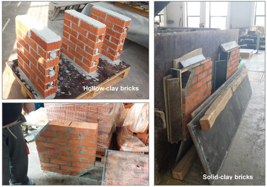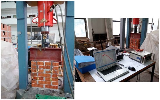 Two basic types of wall element built from hollow-clay were tested in the considered case (Table 1). Two distinct testing protocols were employed to characterize the mechanical response of the masonry wall specimens. The first set of specimens was subjected to uniaxial compressive loading to evaluate their behavior under axial stress conditions (Figure 4). The second set underwent diagonal compression testing, commonly referred to as the shear or diagonal tensile test, to assess the in-plane shear capacity and failure modes (Figure 5).
