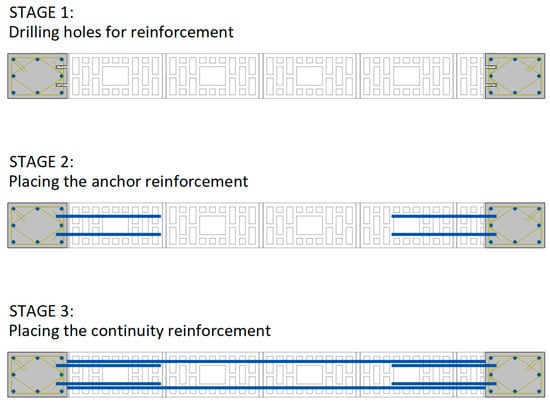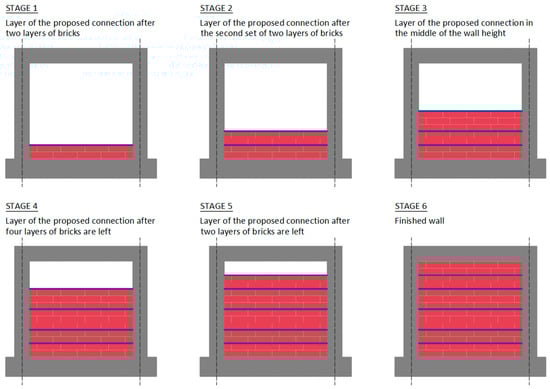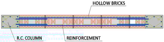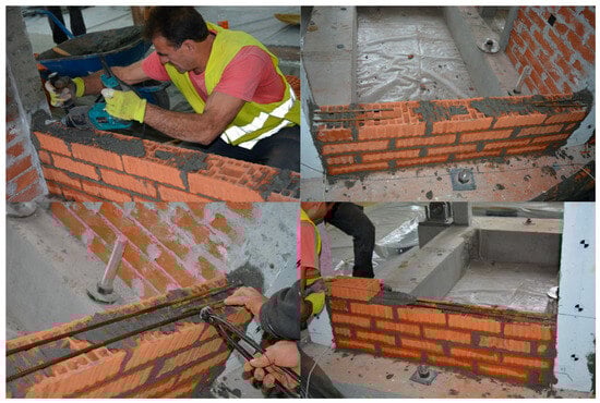 According to the design, the connection between the infill wall and the RC frame is made by two bars ∅6 mm anchored to the columns on the left and right (Figure 12 and Figure 13). The continuity reinforcement is placed throughout the whole length of the span. Above the reinforcement, another layer of mortar with the same depth is installed. This connection is repeated two times at each second layer of bricks starting from the top and bottom side of the wall, and one more is provided in the middle of the wall height (Figure 14). At the bays where there were no columns, the anchorage was performed in the vertical tie. The proposed steel reinforcement is fully embedded within the mortar joints, providing substantial protection against direct exposure to humidity and temperature variations, in a similar way as regular reinforcement in reinforced-concrete elements. Therefore, it is not expecting significant impacts from environmental conditions will affect the performance of the reinforced connections over their service life.