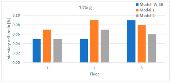 Inter-story drift comparison of Model IW-SB (this study) with Model 1 and Model 2 from FRAMA project [] for 10% g.