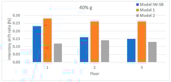 Inter-story drift comparison of Model IW-SB (this study) with Model 1 and Model 2 from FRAMA project [] for 40% g.